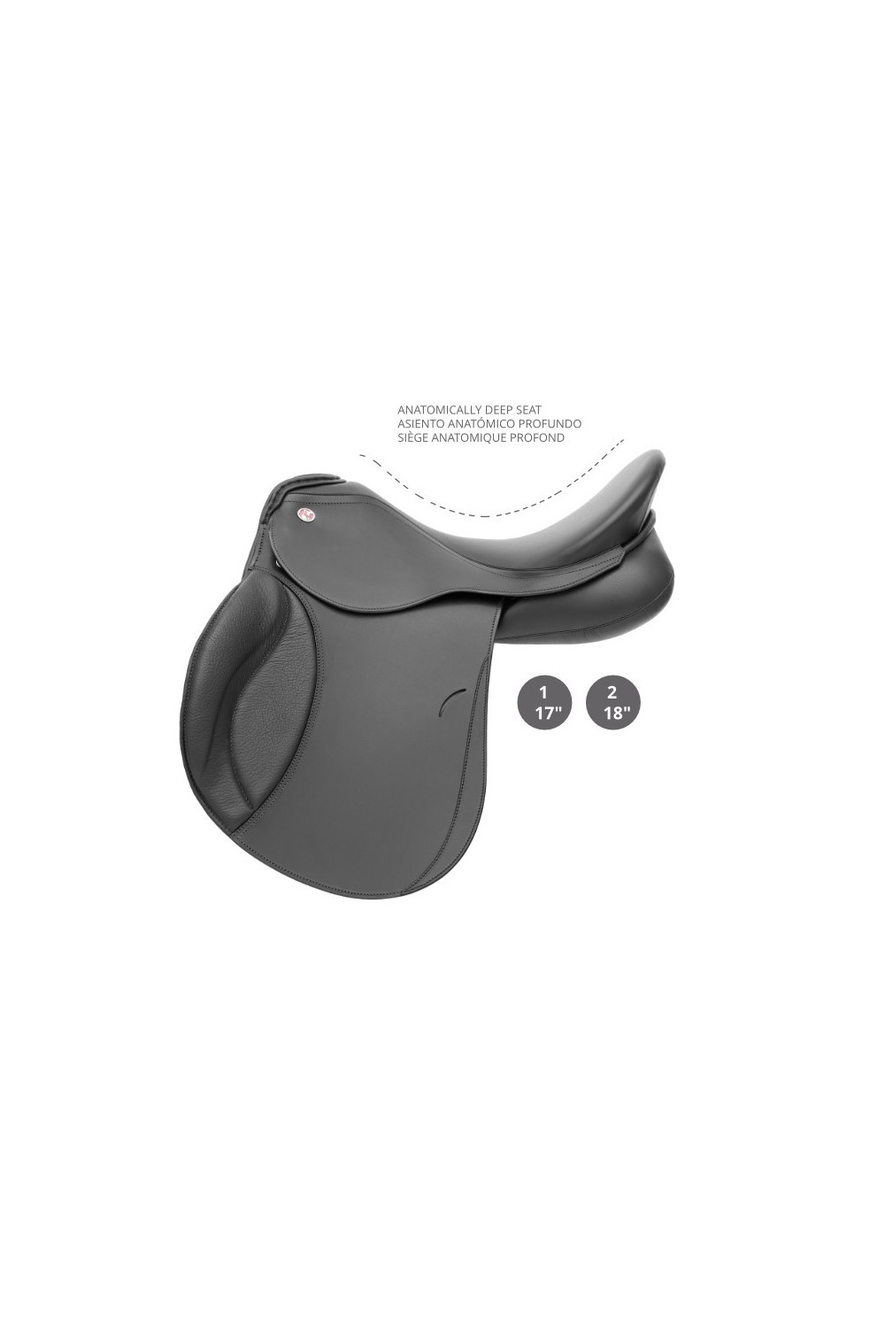 Un aspecto elegante y moderno y una larga experiencia práctica en el campo hacen del modelo Aachen un silla que siempre es adecuada: ya sea que se inicie en doma, en cross-country o cuando se recorren distancias más largas, el jinete se sentará segura y cómodamente en este silla robusta. Gracias a la posición preformada de las rodillas con rodilleras de tamaño mediano, es posible en cualquier momento un ajuste flexible a las necesidades individuales del jinete. El clásico versátil. Equipamiento estándar: baste reforzado DP clásico relleno de lana - Latiguillos cortos - Asiento profundo - Rodilleras de tamaño mediano con velcro debajo del faldón de la silla - Tamaño del asiento 1 o 2 - Cuero de vaca liso, negro
