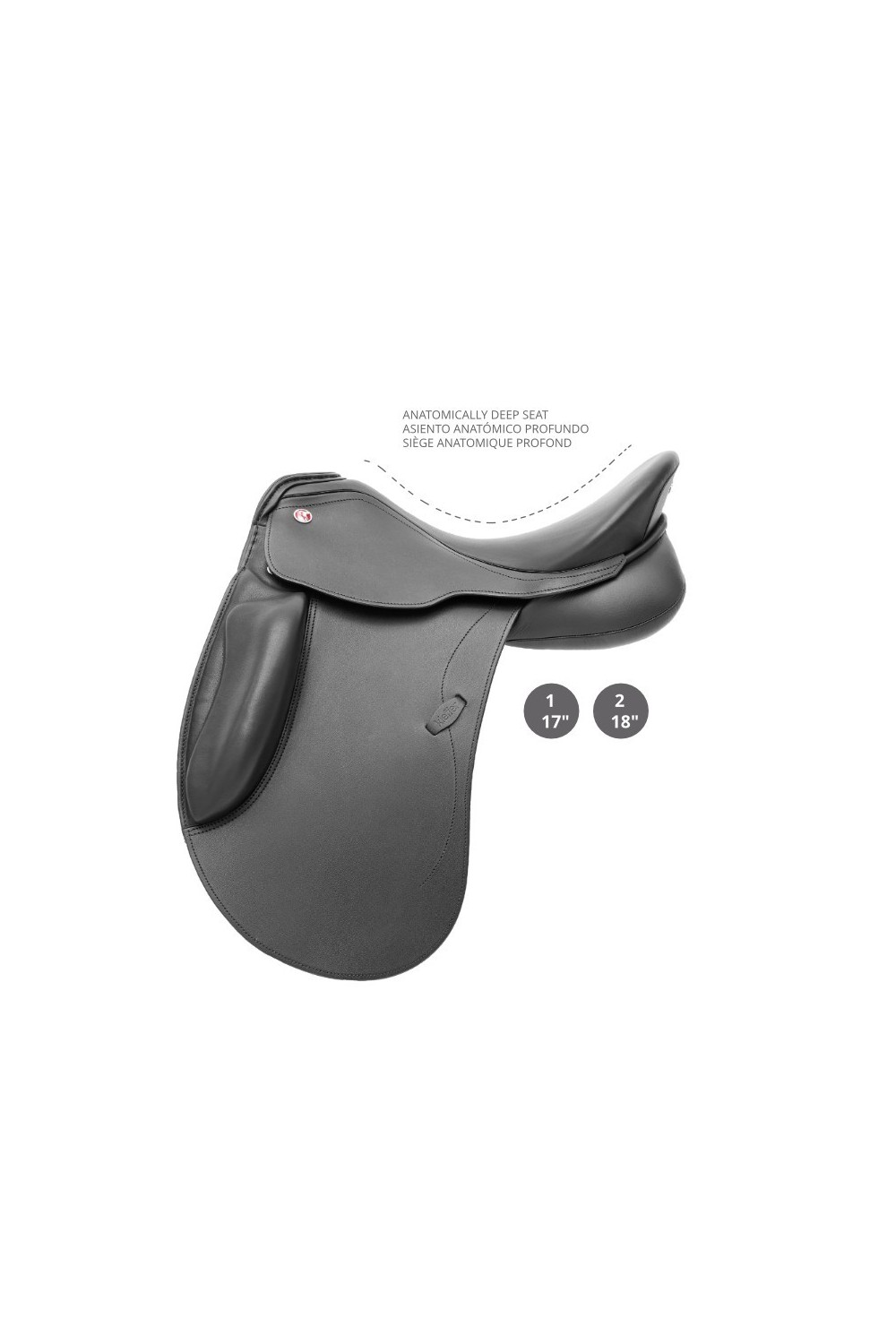 La silla de doma Mí¼nster ofrece mayor comodidad y libertad de movimiento de los hombros del caballo con sus bastes recortados en la zona delantera. En la zona trasera, el corte de los bastes Classic proporciona una superficie de contacto más plana con una distribución optimizada de la presión y al mismo tiempo crea una nueva sensación de asiento con mayor cercanía al caballo. Especialmente los caballos bien entrenados con un arco costal ancho se beneficiarán del corte optimizado del panel. Para caballos con un desarrollo muscular bastante débil en la zona del músculo trapecio/espinal, se recomienda el panel de silla Classic con corte Passage en la parte delantera para compensar estos desequilibrios musculares. Su diseño inusual destaca por la forma de la rodillera, para la cual se utiliza una espuma especial que también se utiliza en productos ortopédicos para estabilización y acolchado. Para el jinete, la combinación de una curva del asiento anatómicamente profunda, las musleras y los materiales utilizados crean una comodidad especial con un agarre seguro en la silla. El asiento suave no aprieta al jinete y le permite balancearse libremente con el movimiento del caballo. Las suaves musleras colocados en el faldón guían la pierna discretamente sin mantenerla en una posición. Características estándar: Panel de refuerzo clásico con corte Drop-Panel en el área de los hombros - Correas de cincha largas - Sistema de cincha flexible en forma de V - Asiento anatómicamente profundo - Muslera colocada sobre el faldón - Talla 1 o 2 - Cuero de vaca liso, negro