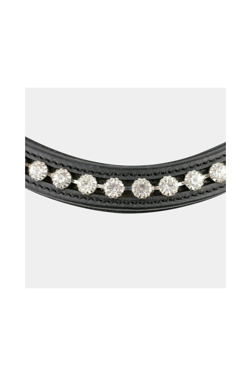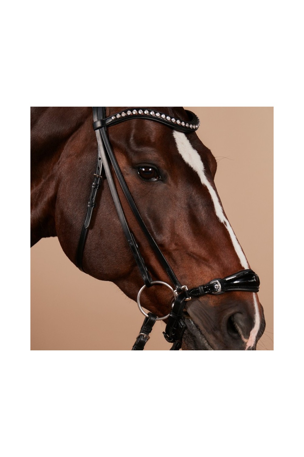 Esta atractiva cabezada para filete Melody tiene muserola ajustable. Esta brida tiene hebilla en el cuello y tiene un testero acolchado súper suave. La hermosa muserola de charol con forma abombada se puede ajustar en medida gracias a las dos hebillas laterales con acolchado y ofrece opciones de ajuste individuales. Hecha de cuero de la mejor calidad - Se abrocha sobre el testero suavemente acolchado - Muserola de charol abombada y ajustable en ancho - Frontalera curva con cristales blancos - Hebillas cromadas - Viene con riendas de cinta