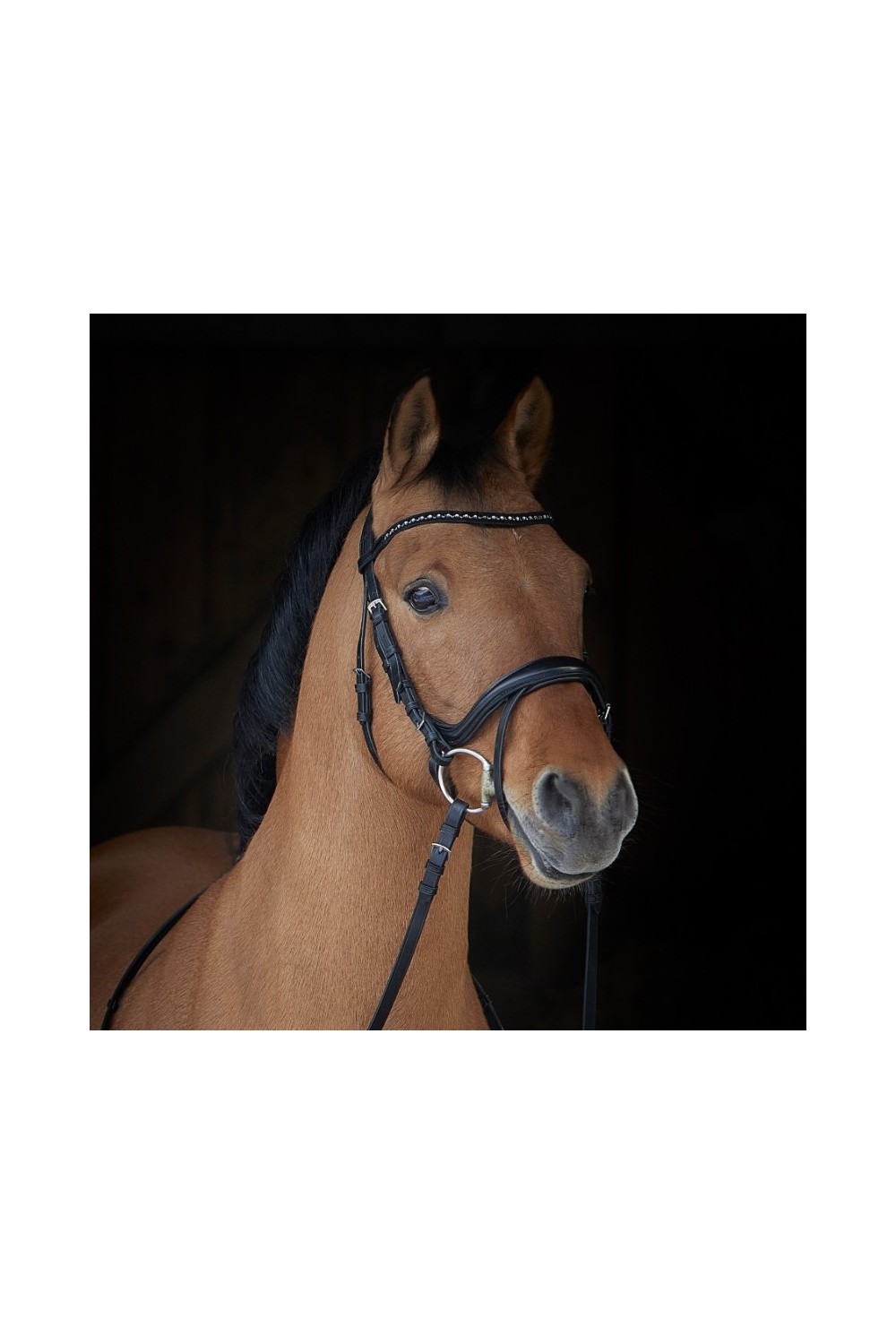 Esta hermosa cabezada con cierrabocas, hecha de cuero de alta calidad, está equipada con un testero profesional suavemente acolchada con un diseño recortado en las orejas. La muserola suavemente acolchada está diseñada anatómicamente para distribuir suavemente la presión evitando picos de presión desagradables en los nervios faciales sensibles o fricción en el pómulo. Para los jinetes que prefieren una brida sin cierrabocas, ésta se puede quitar sin dejar rastro. Hecha de cuero de la más alta calidad - Testero Professional (Softtech) con acolchado suave y diseño recortado en la oreja - La muserola suavemente acolchada se sujeta al testero en ambos lados, el cierrabocas integrado se puede quitar sin dejar rastro - Adornado con hermosos cristales Kieffer Ultrashine® - Hebillas cromadas - Viene con riendas de cinta