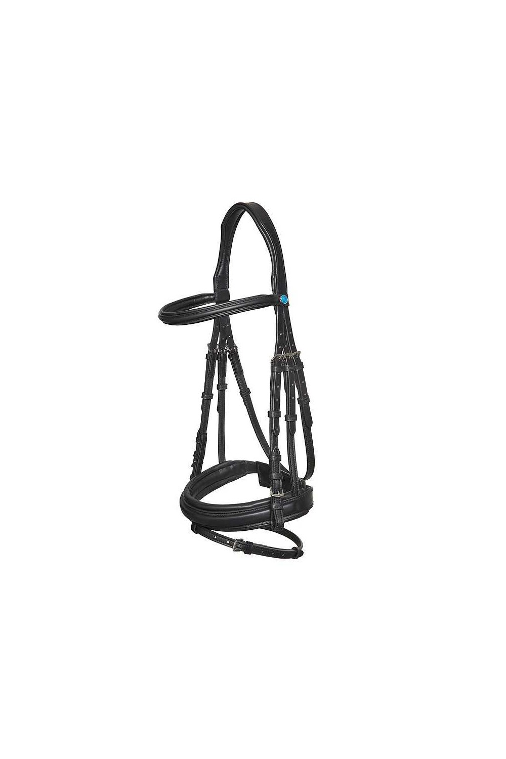 Bonita cabezada inglesa con frontalera curvada de brillantes. Con testero con diseño anatómico curvado en las orejas para evitar molestias provocadas por el roce. Muserola suave y acolchada. Hebillas cromadas. Incluye riendas de lona.
