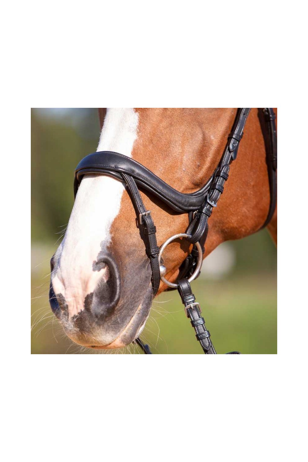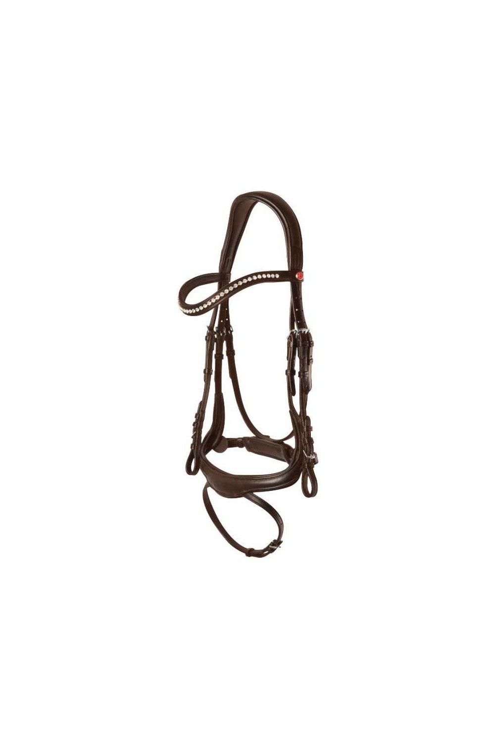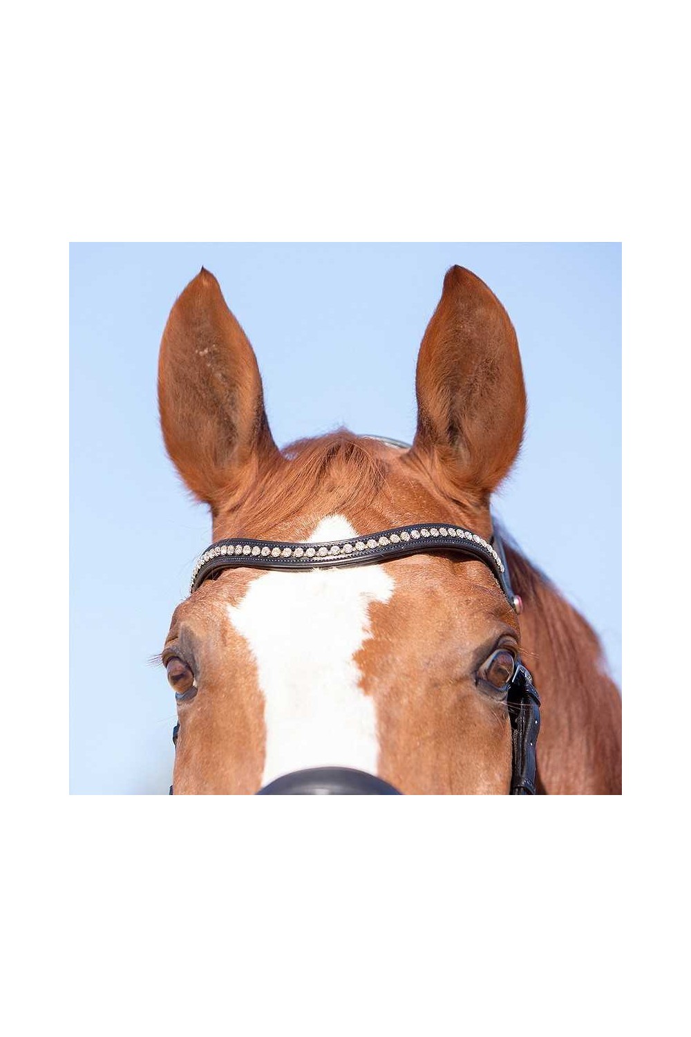 El testero tiene un ajuste ancho y anatómico y está recortado en la oreja para permitir un movimiento adicional en esta área sensible y reducir la presión en la nuca. Para aumentar aún más la comodidad, la testera, la frontalera y la muserola están suavemente acolchadas. Una característica especial de esta brida es la muserola de forma anatómica con cierrabocas. Este cierrabocas es completamente extraíble, lo que brinda una apariencia más limpia cuando no se requiere. La brida viene con una hermosa frontalera curva adornada con cristales blancos.