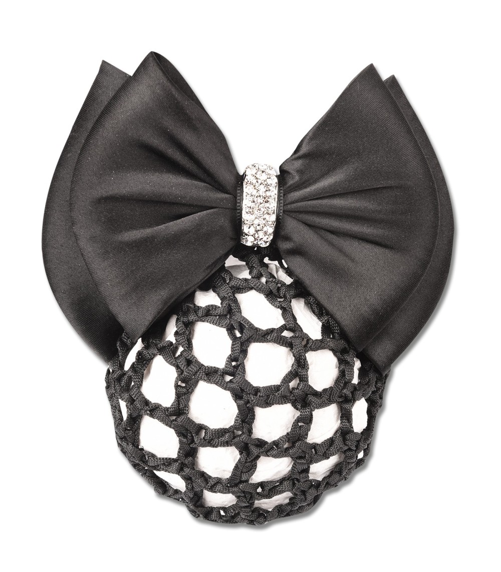 Redecilla para el moño elegante de color negro. Un pequeño anillo plateado con relleno de piedras finas decora el lazo que se incluye.