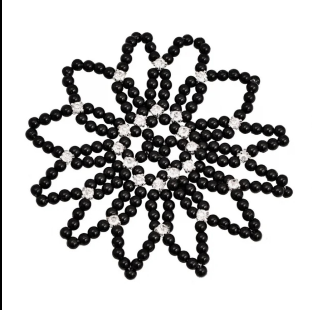 Preciosa redecilla realizada íntegramente en cristales y perlas negras.
