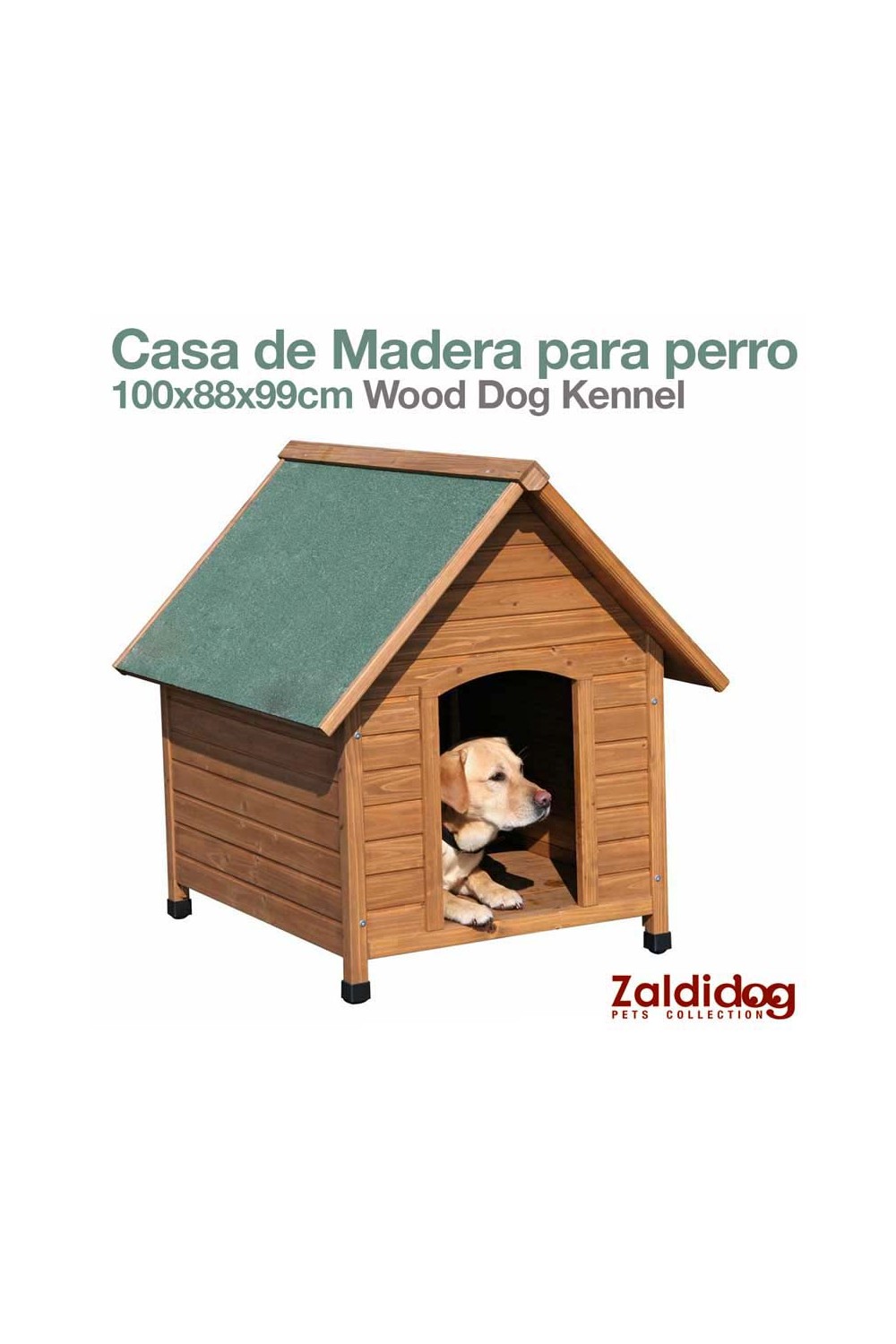 Caseta de madera para perro.Tejado a dos vertientes, cubierto con un betún asfáltico resistente a la intemperie.Parte exterior tratada con una pintura protectora de madera.Patas de plástico regulables en altura.Fácil de montar. Incluye instrucciones de montaje.Se suministra desmontada y embalada en caja de cartón.Dimensiones: 100 x 88 x 99 cm (longitud x anchura x altura)Color: Madera natural con tejado verde.
