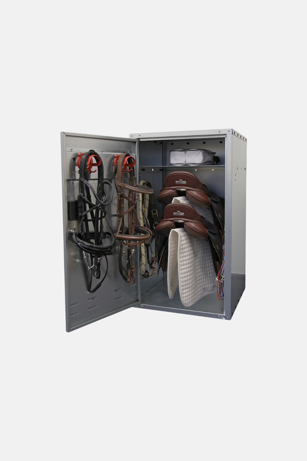 Armario para guardar todo el equipo de montar. El baúl viene sin montar. El montaje es sencillo y va con sus instrucciones y embalaje ideal para el transporte. Contiene dos portasillas, dos portabridas y también tienen unos ganchos para partes pequeñas así como con un estante.