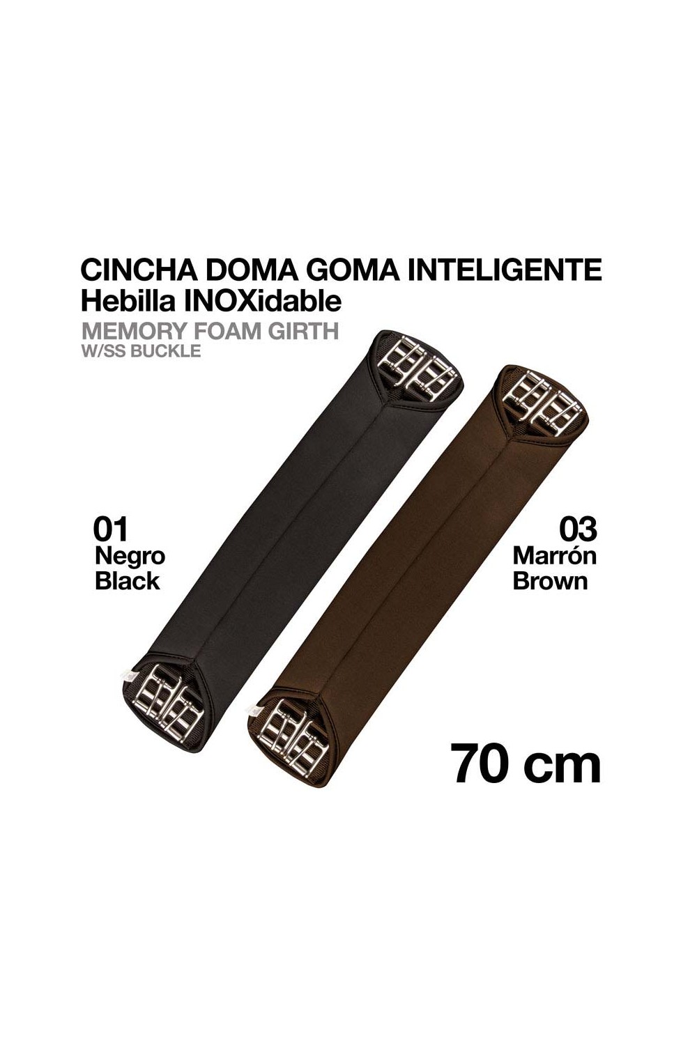 Cincha de doma fabricada con goma inteligente de color marrón.Este tipo de goma se adapta perfectamente a la forma del caballo y la mantiene, lo que le proporciona mayor comodidad y libertad de movimientos.Cuando la cincha se retira, la goma inteligente vuelve a su estado original, recuperando su posición normal y evitando así deformaciones por lo que se puede utilizar para más de un caballo.Hebillas inoxidables con coscojo.Sin elásticos.Tamaños: 50 cm - 60 cm - 70 cmColor: Negro, Marrón.