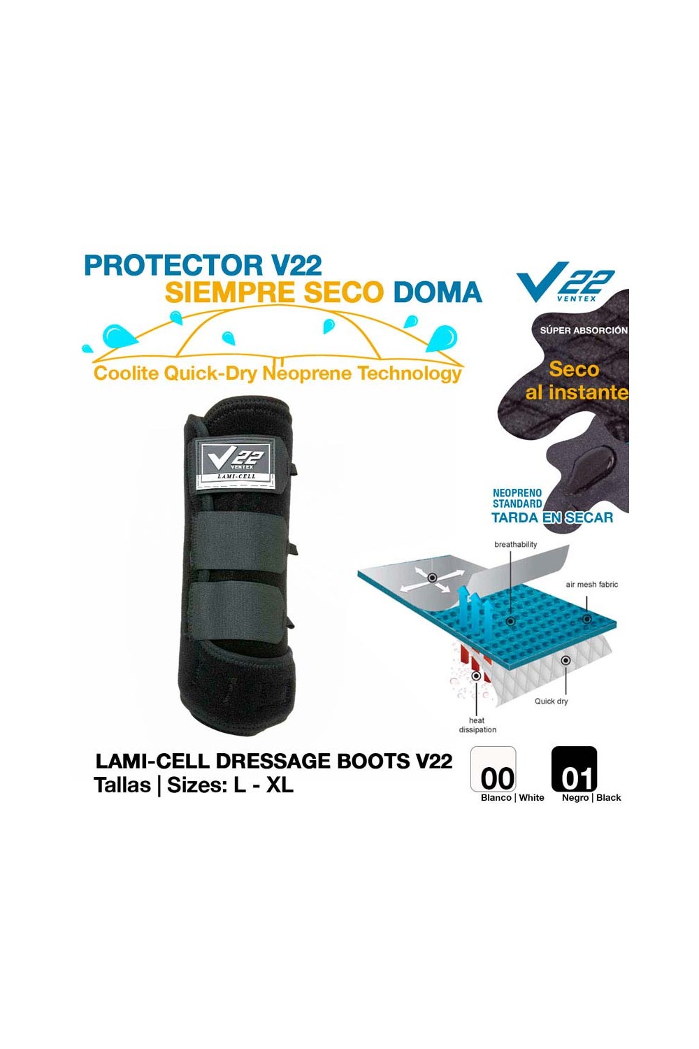 Protector de doma V22 SIEMPRE SECO fabricado en neopreno, con forma anatómica para mayor confort y largas bandas de velcro para un perfecto ajuste en la pata del caballo.