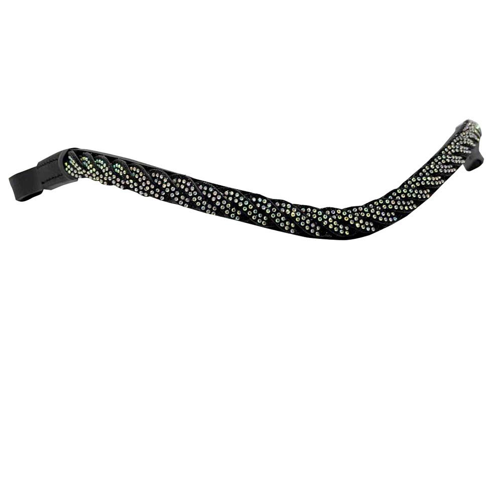Frontalera para cabezada inglesa. Trenzada con tiras negras compuestas por cristales brillantes de diferentes tonalidades según el reflejo de la luz.
