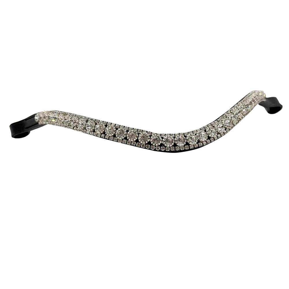 Frontalera inglesa curvada, adornada en hilera central de piedras de cristal blancas y grandes. Se completa arriba y abajo con cadena de cristales pequeños blancos y metal plateado.