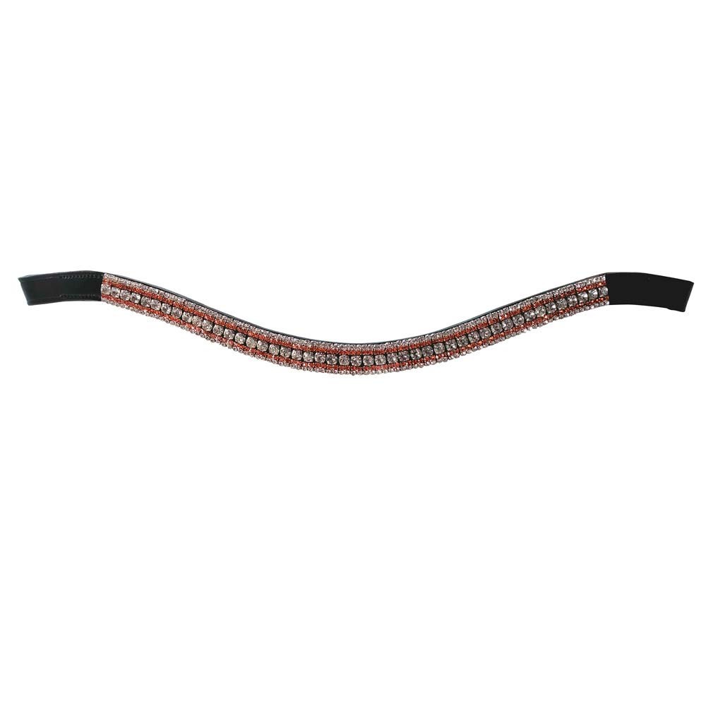 Frontalera curvada con fila central de cristales brillantes blancos en combinación con los de arriba y abajo que van en tonos pardos y rojizos.