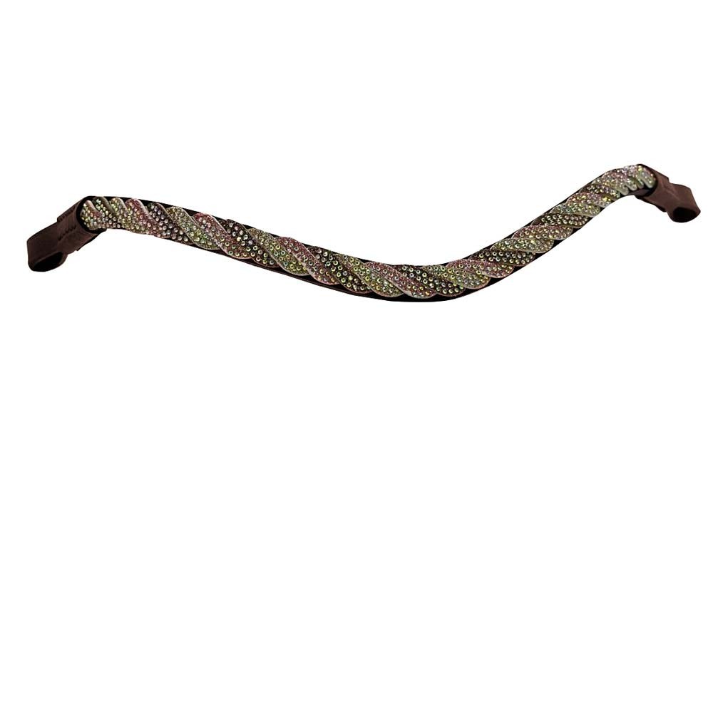 Frontalera para cabezada inglesa. Trenzada de doble tira adornadas con cristales dobles de tonalidades rosas, dorados y marrones.
