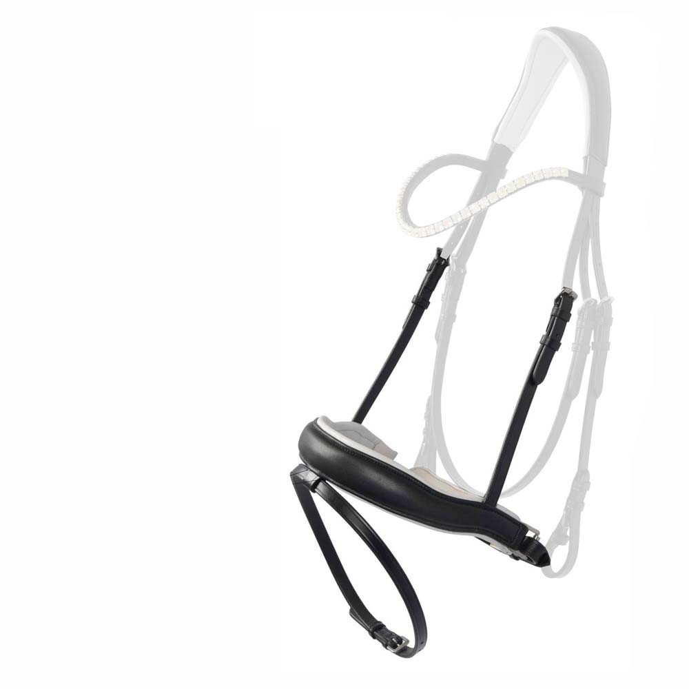 Muserola ancha, con cierrabocas desmontable, protector alomado blanco en barbilla desmontable y cierre de hebilla.