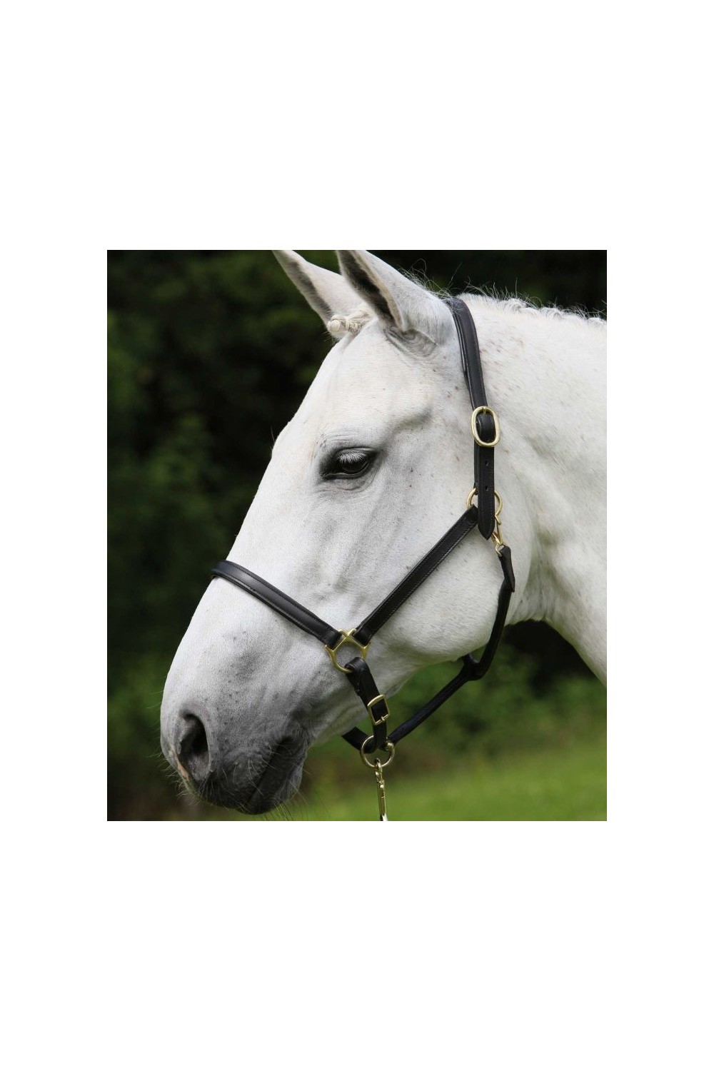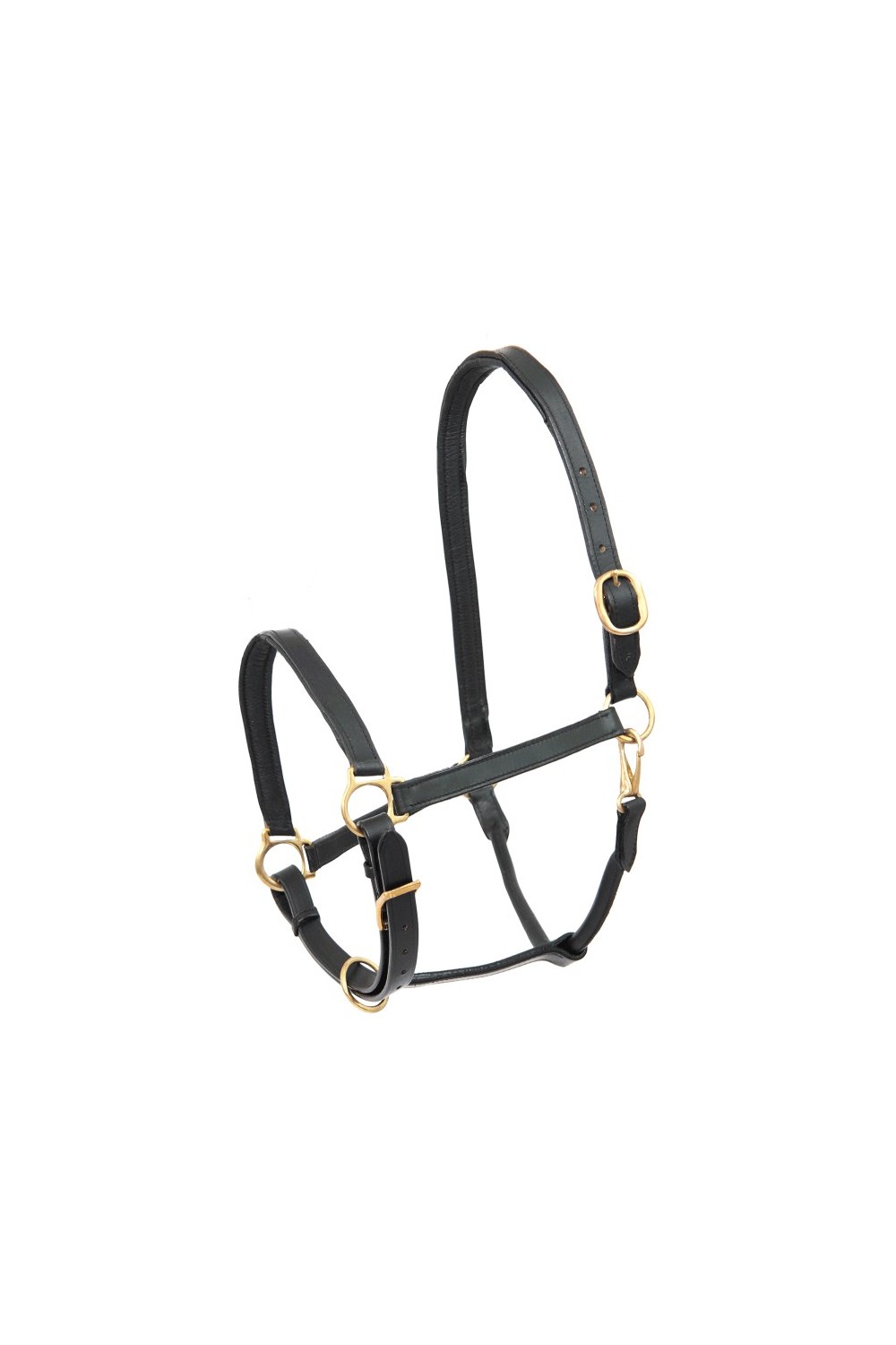 Cabezada para cuadra de cuero resistente forrada en zona muserola y testera. Hebillas latonadas y regulables en zona de la testera y ahogadero.