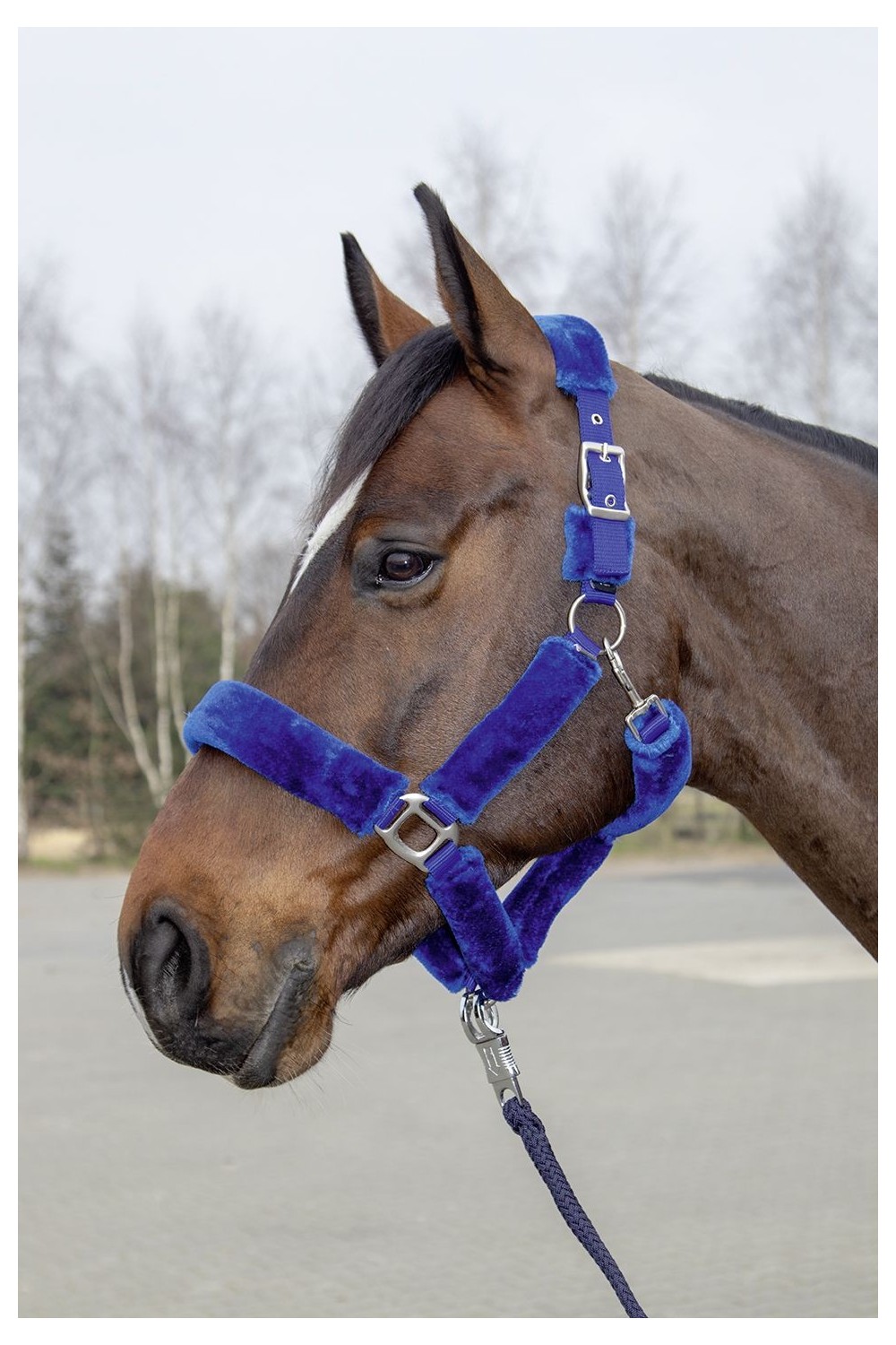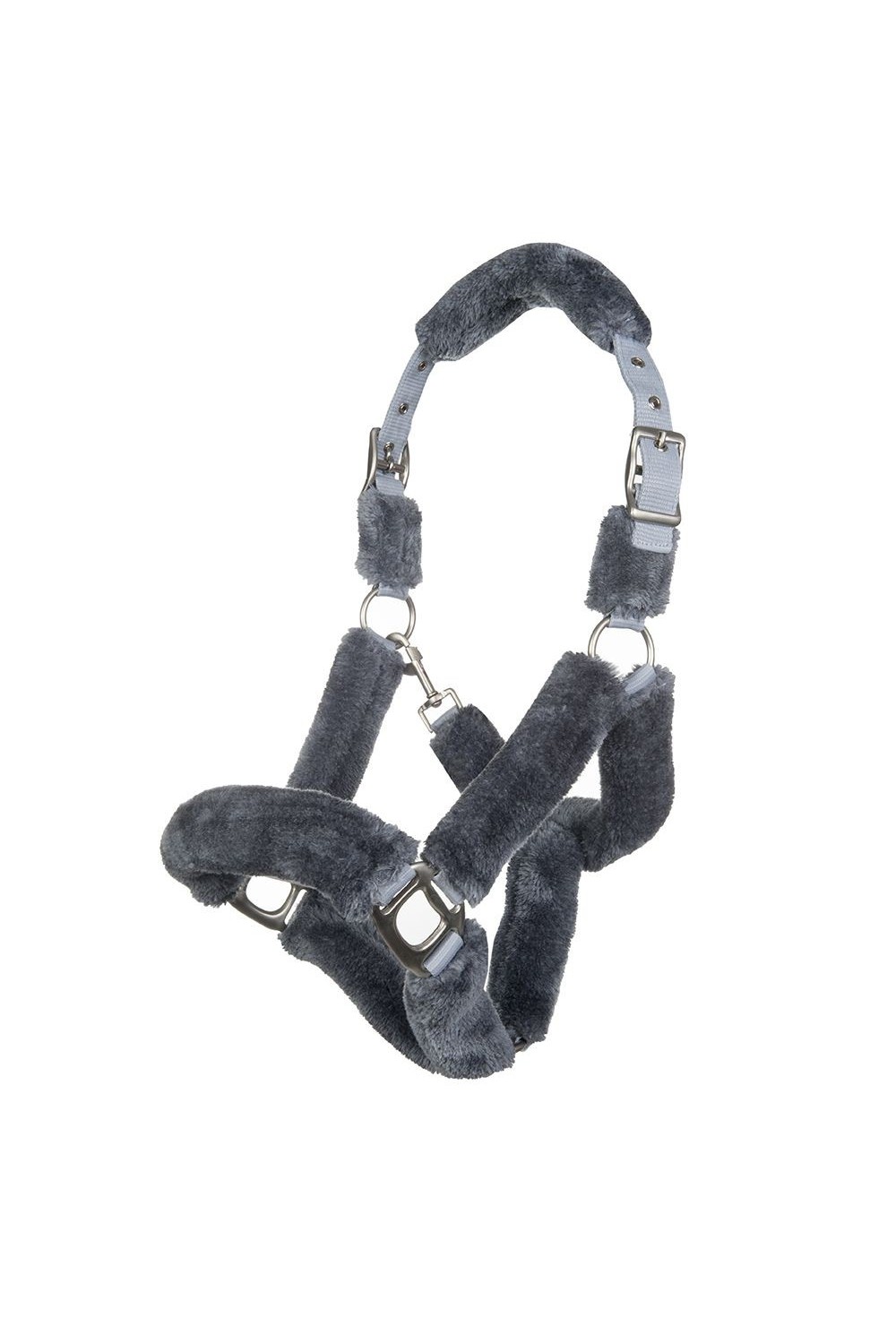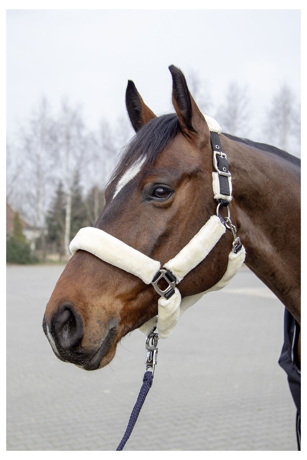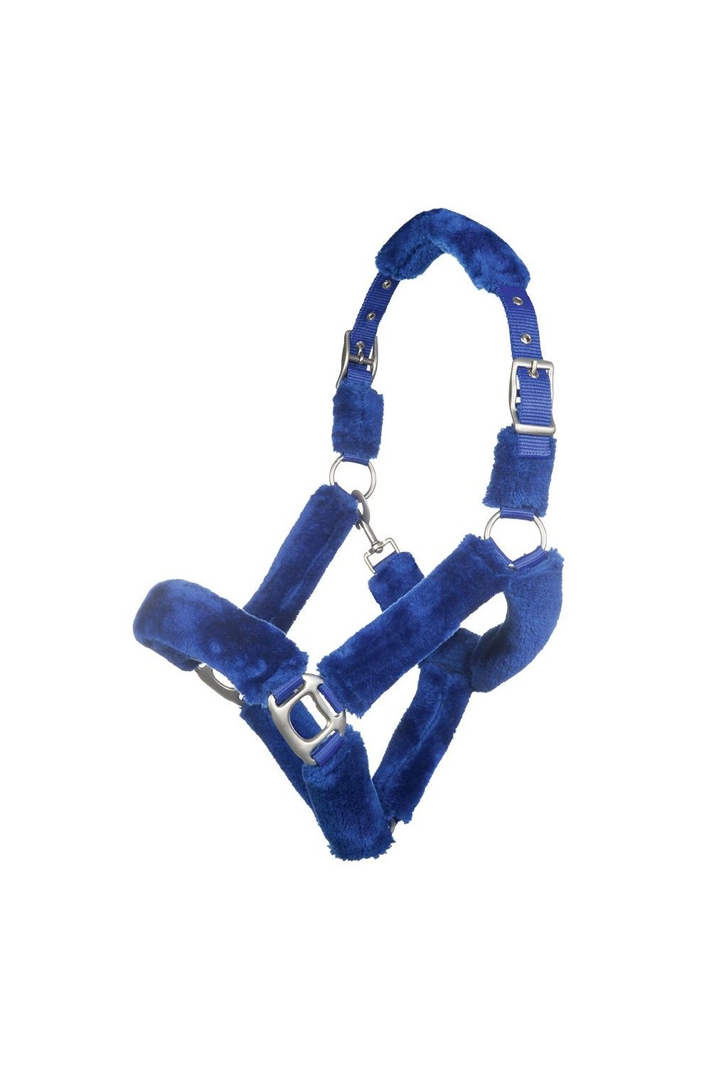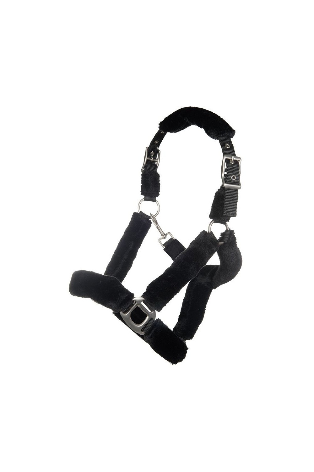 Preciosa cabezada acolchada de borreguillo con hebillas plateadas. La abertura es mediante un mosquetón. Se puede ajustar por ambos lados de la cabezada.