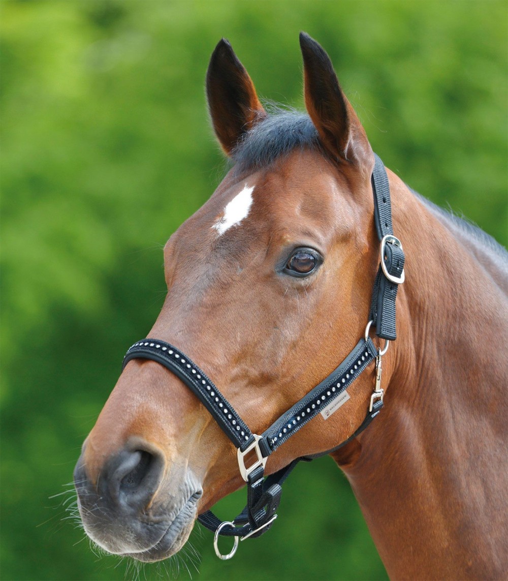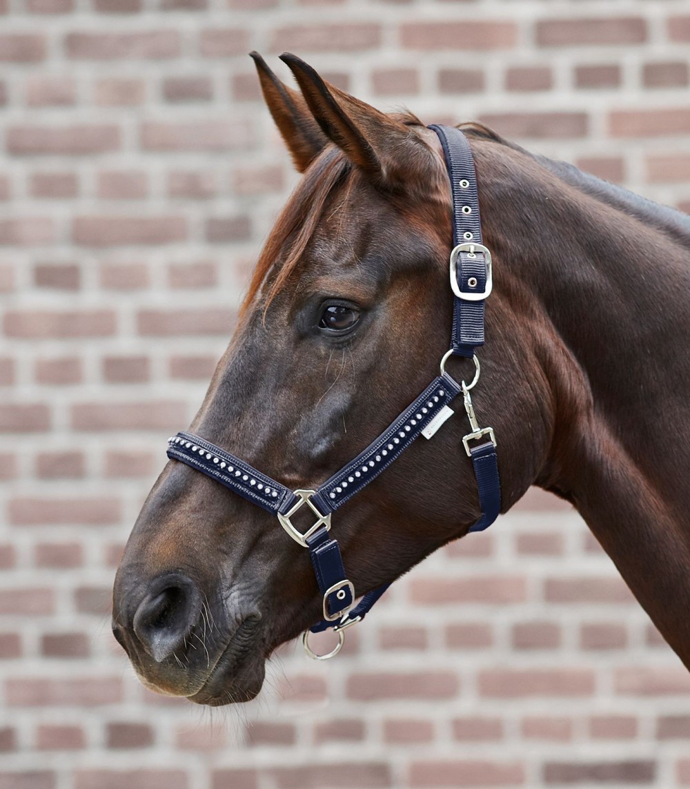 Exclusiva cabezada de cuadra con brillos aplicados sobre cinta de terciopelo en la zona de las mejillas y de la muserola. Con suave acolchado. Muserola y testera ajustables para un excelente ajuste.