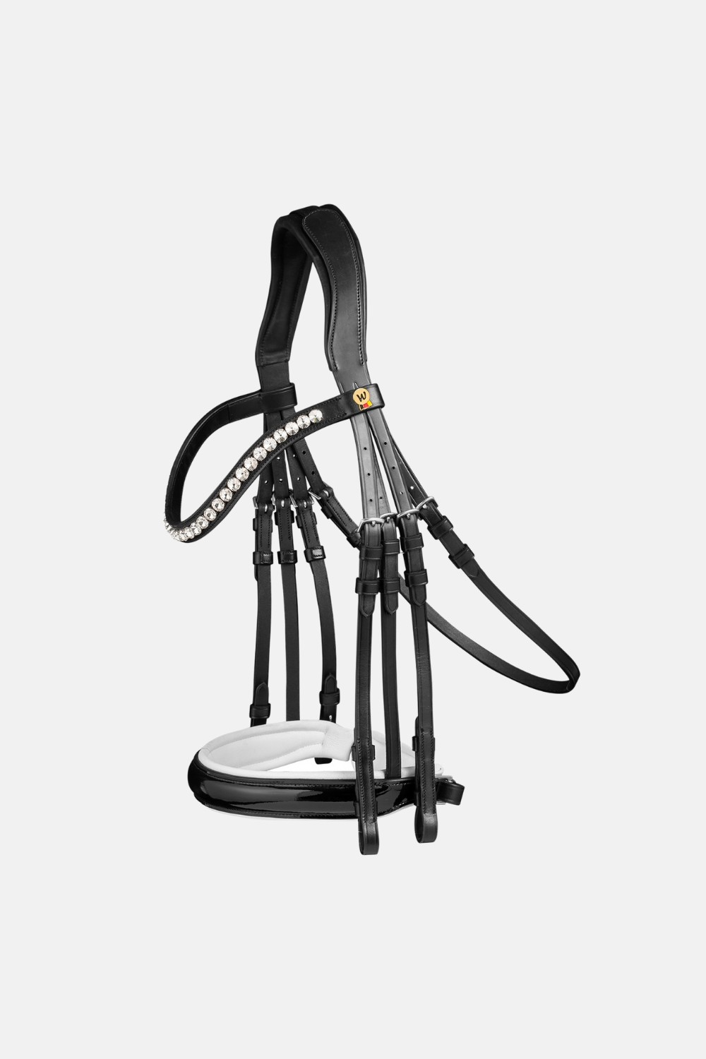 Cabezada de doble rienda estilo sueca de la colección S-Line. Compuesta de una testera anatómica, una frontalera cubierta de cristales brillantes, una muserola de suave acolchado y las hebillas de acero inoxidable.