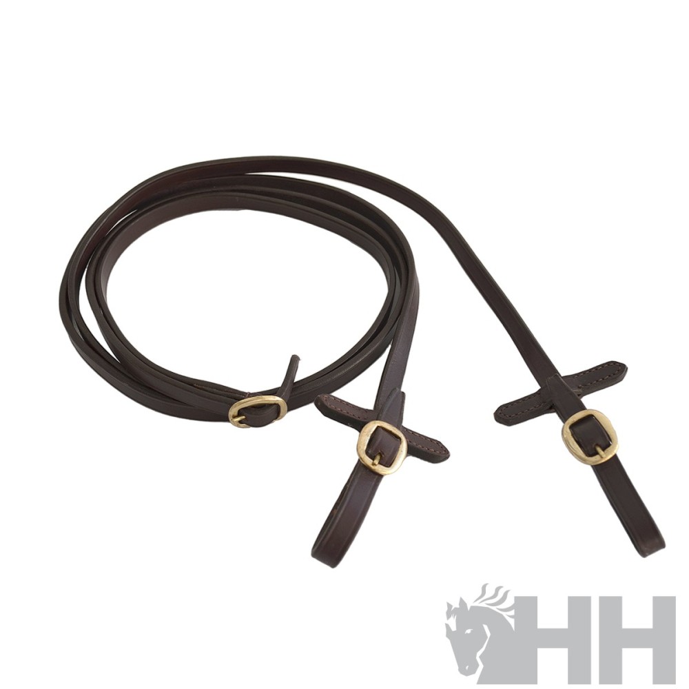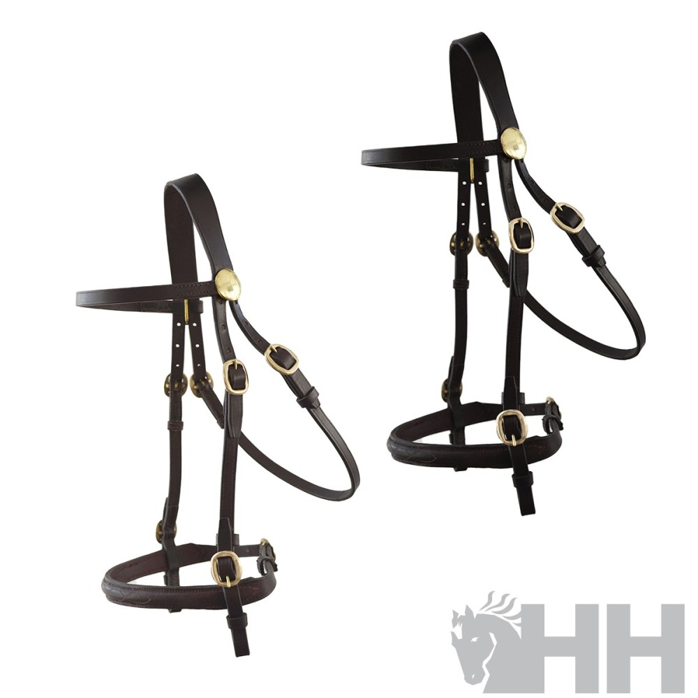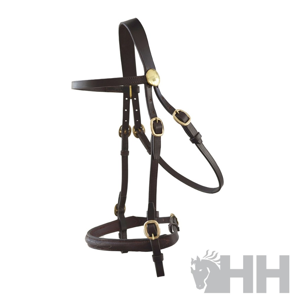 Hebillas doradas, sin cierrabocas y con riendas de cuero lisas.