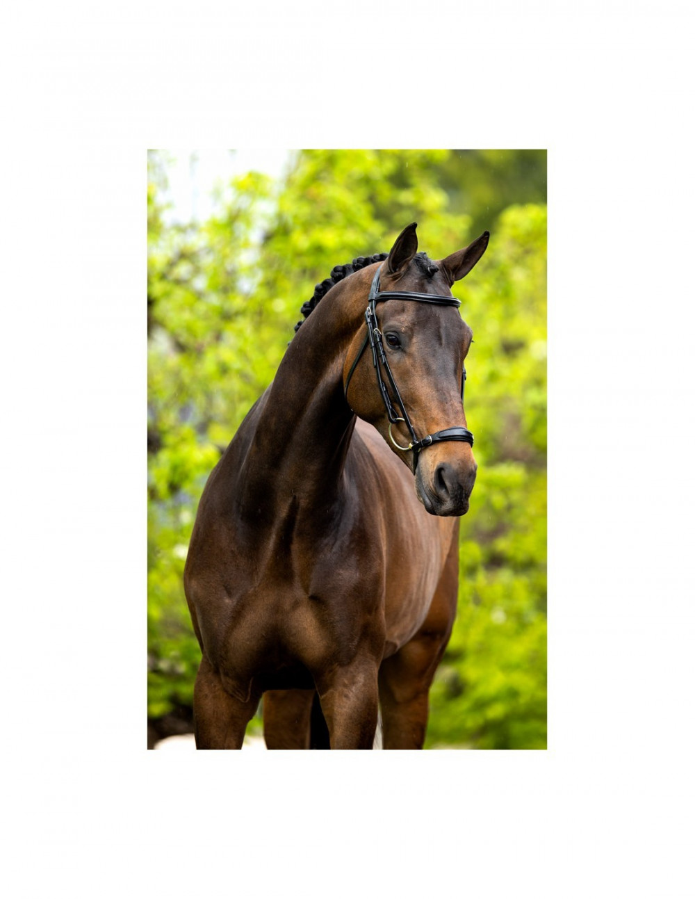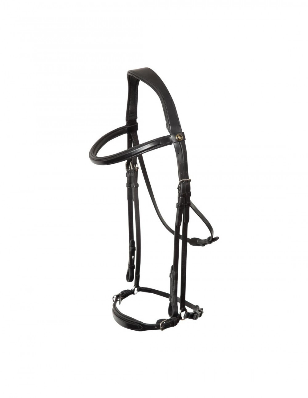 Cabezada simétrica anatómicamente acolchada y suave. La banda de la frente recta y la muserola caída se elevan en forma cuadrada. Las carrilleras cuentan con tacos de gancho y el latigazo se puede ajustar con una hebilla en la parte inferior. La muserola caída es ajustable en ambos lados y contiene un acolchado ancho y suave. La brida presenta accesorios redondos, brillantes y de color plateado.