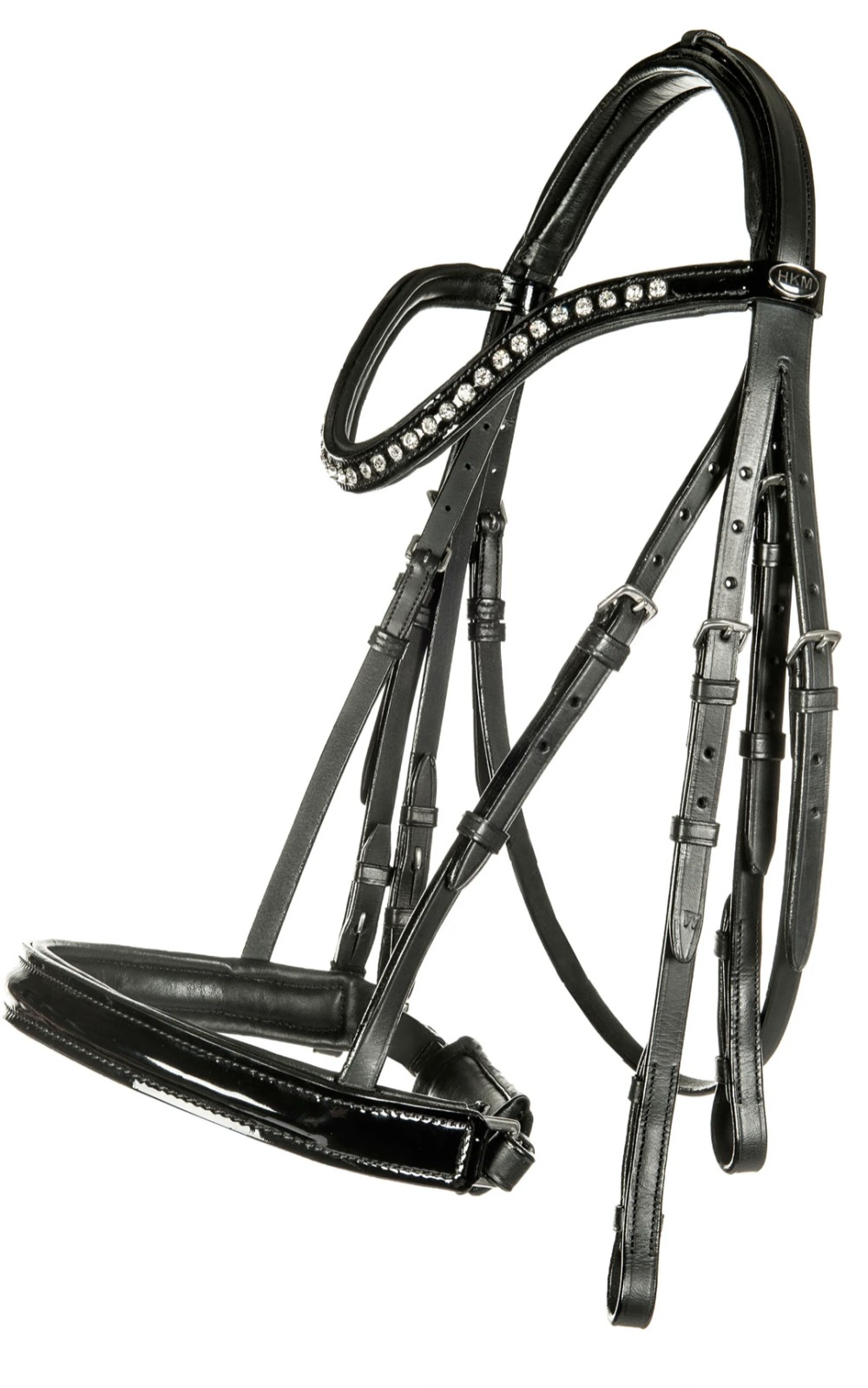 Brida simple estilo inglesa. Destaca mucho esta brida por el diseño en charol de su frontalera y muserola.