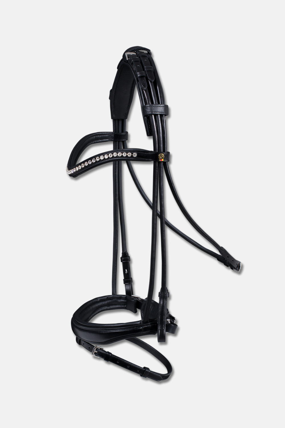 Cabezada simple de montar estilo inglesa. Con costura tubular, en la zona de los montantes y el ahogadero. La frontalera se compone de brillantes preciosos; la zona de la muserola y testera esta hechos en un suave acolchado. Las hebillas estan hechas en un acero inoxidable.
