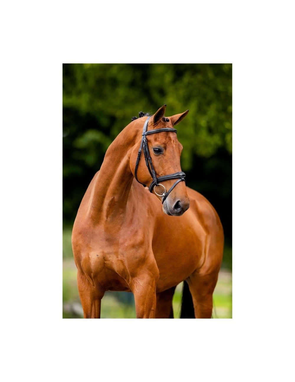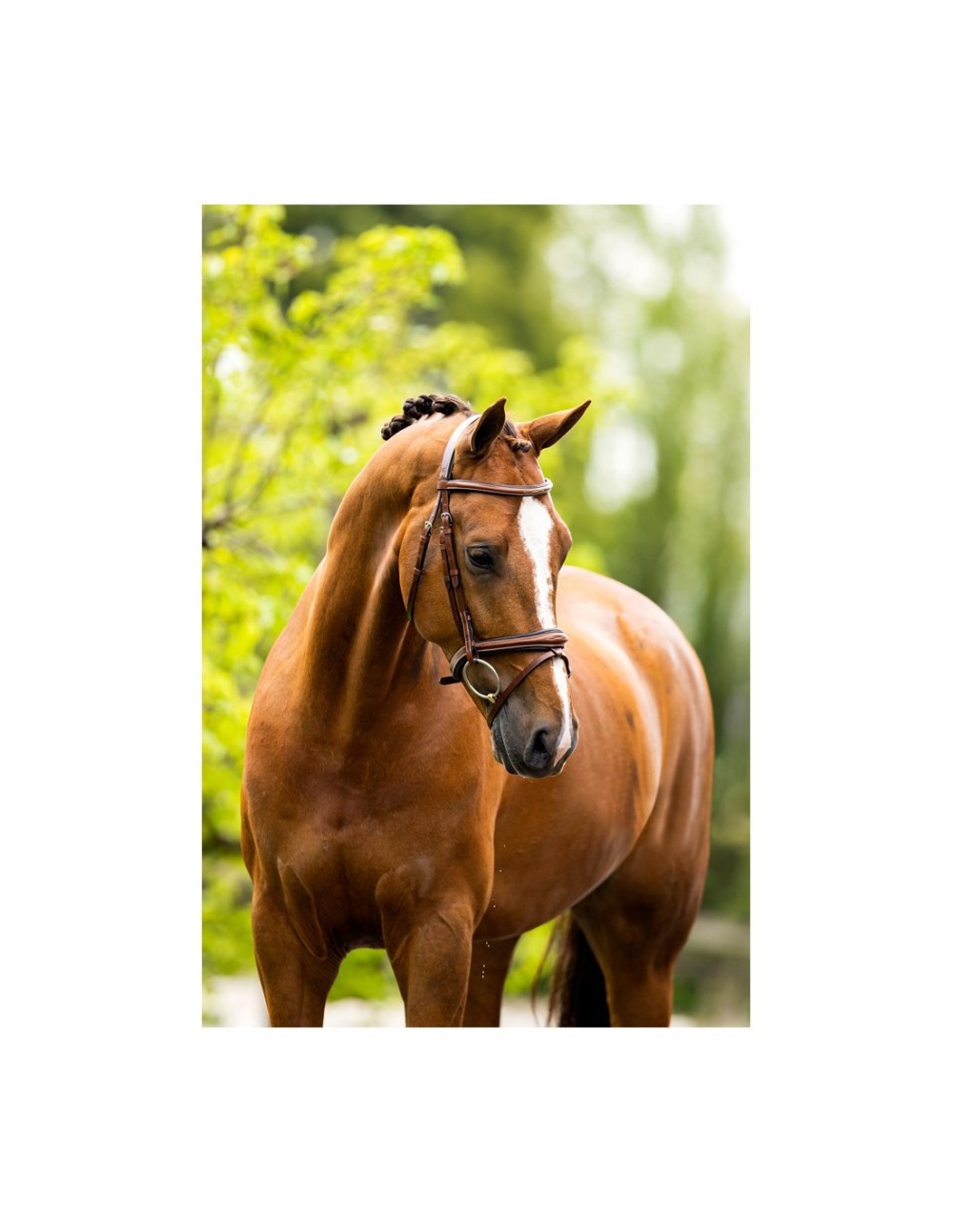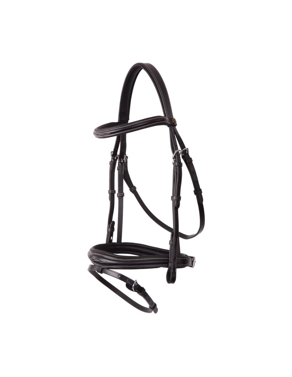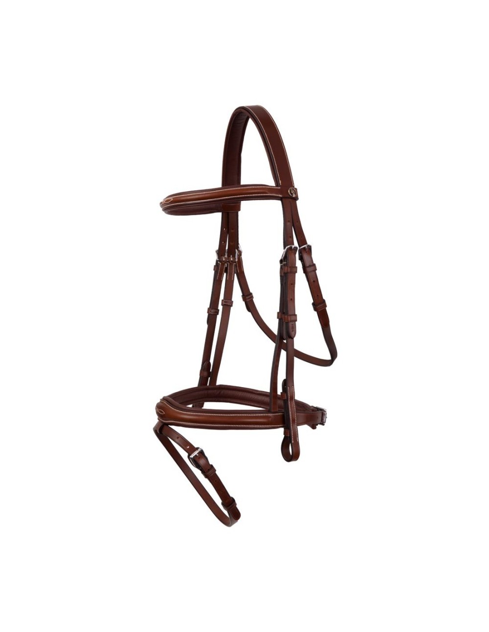 Esta brida simétrica hecha de cuero europeo de alta calidad presenta un tocado con un suave acolchado. Su muserola esta formada redondeada levantada y suavemente acolchada. Presenta accesorios de color plateado brillante hechos de latón cromado.