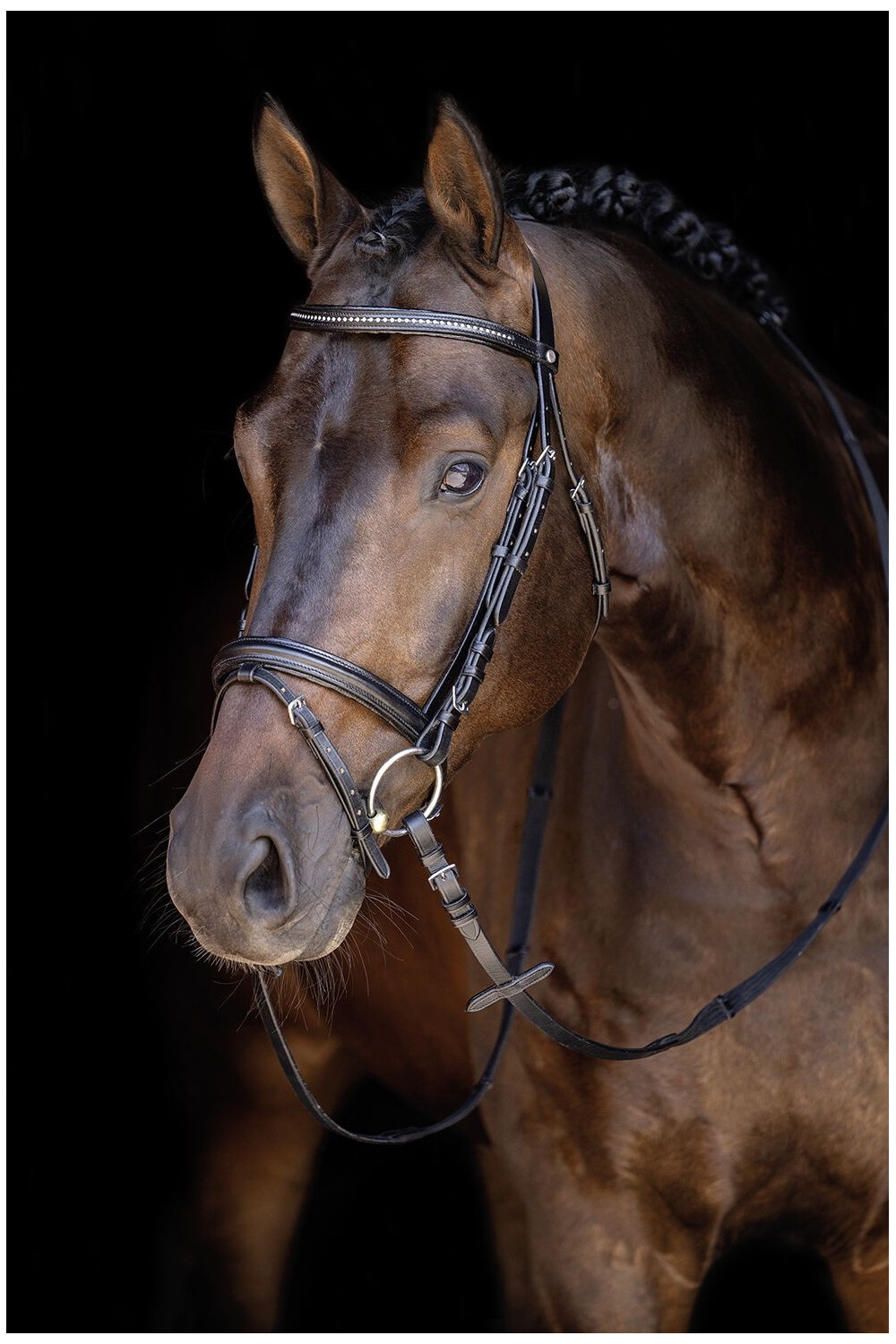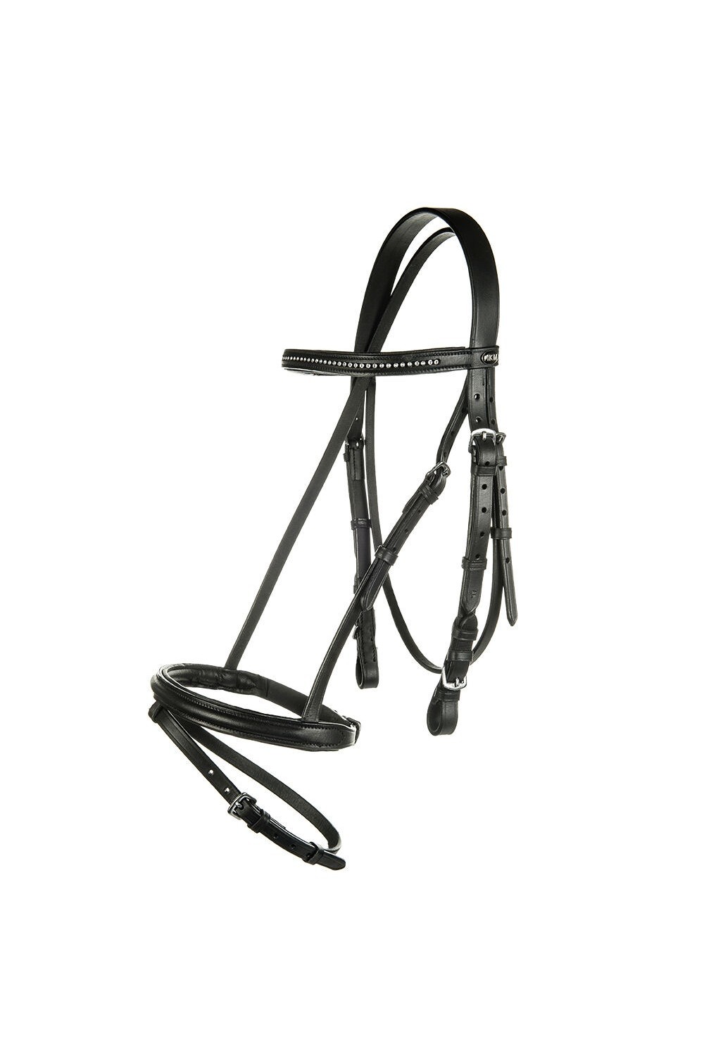 Brida simple estilo inglesa. Vienen con unas riendas de topes con cuero. La frontalera esta compuesta por una pedrería fina.