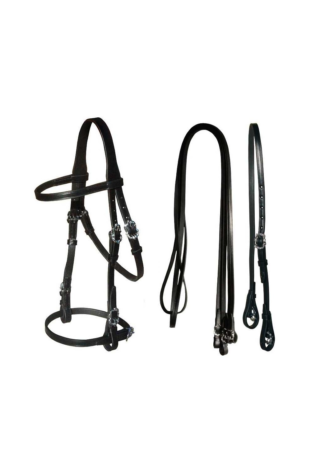 Cabezada portuguesa fabricada en España artesanalmente por Marjoman con cuero de primera calidad y hebillas de cortesí­a. Incluye las dos riendas y el montante.