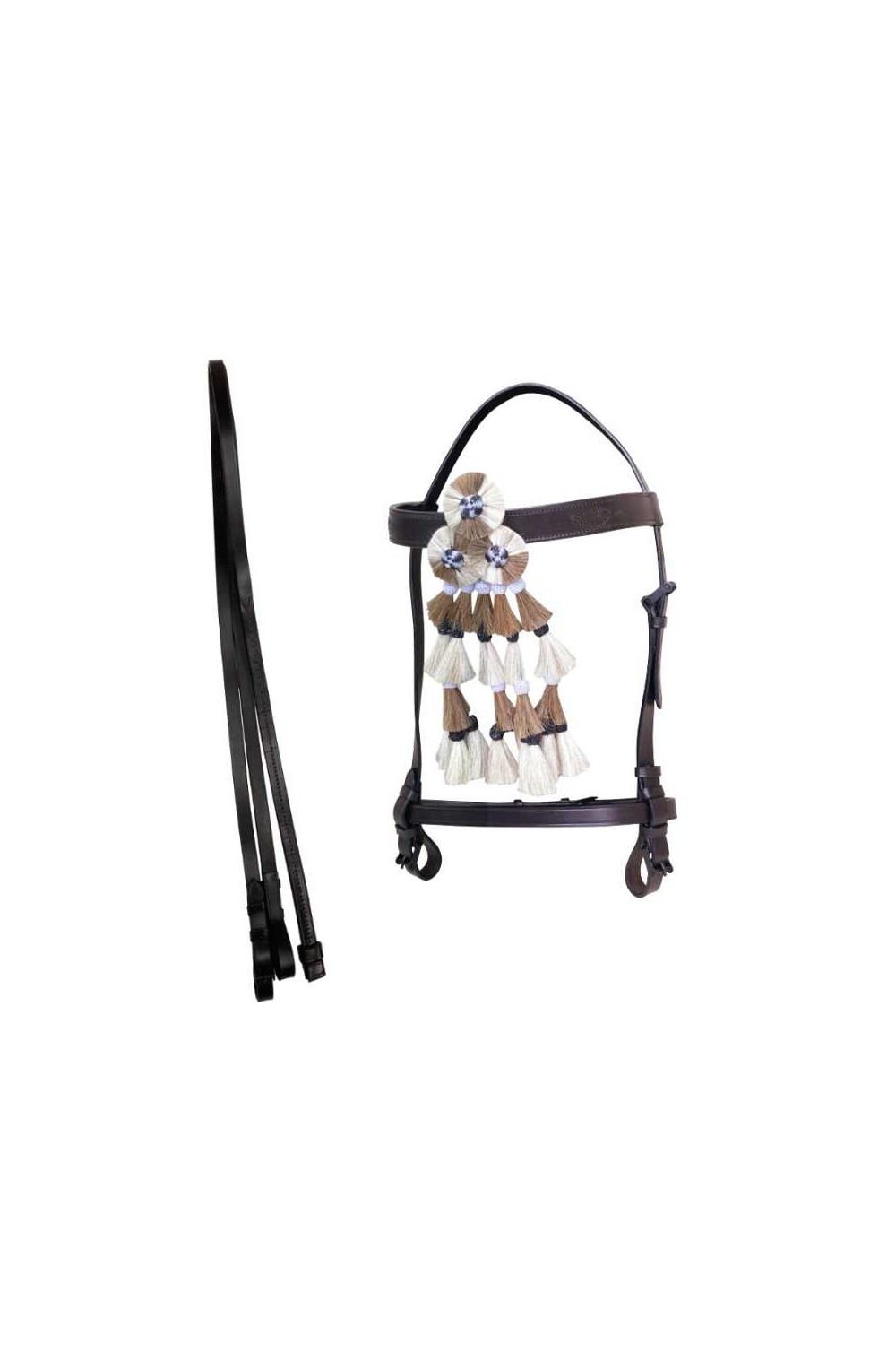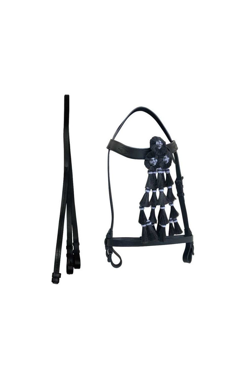 Cabezada para monta vaquera española realizada en cuero con hebillas pavonadas. Decorada con bonito mosquero de pelo y detalle de piña en la frontalera. Con hebilla de ajuste en la carrillera izquierda y en la muserola. Incluye riendas.