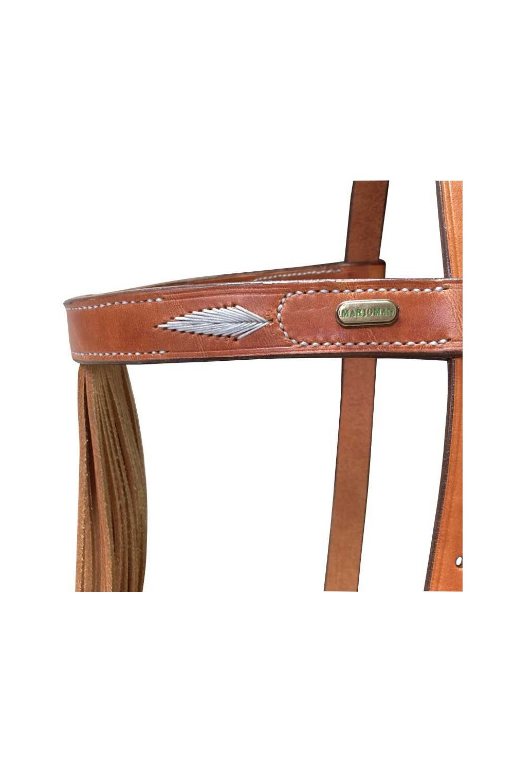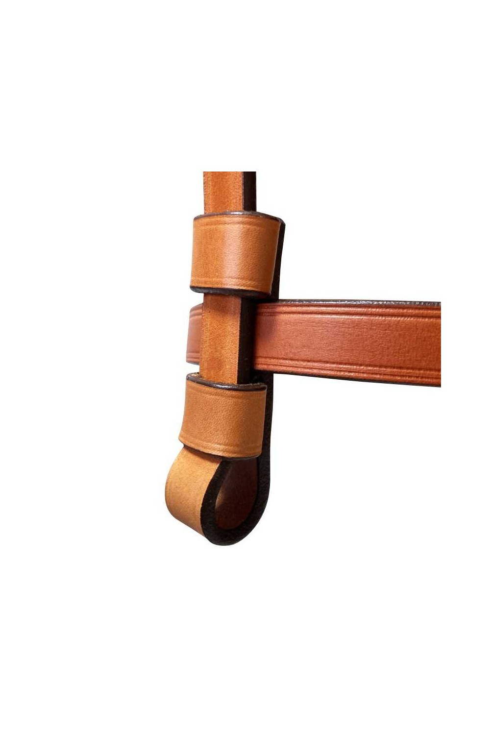 Cabezada de estilo vaquero, especial para randonée (trekking). Sus riendas especiales de 2 metros están inspiradas en las largas riendas tejanas, que al desmontarse, pueden emplearse como ramal para atar al caballo. Sistema sin hebillas en riendas y carrilleras, el bocado o filete se engancha cómodamente gracias a sus pasadores de cuero.