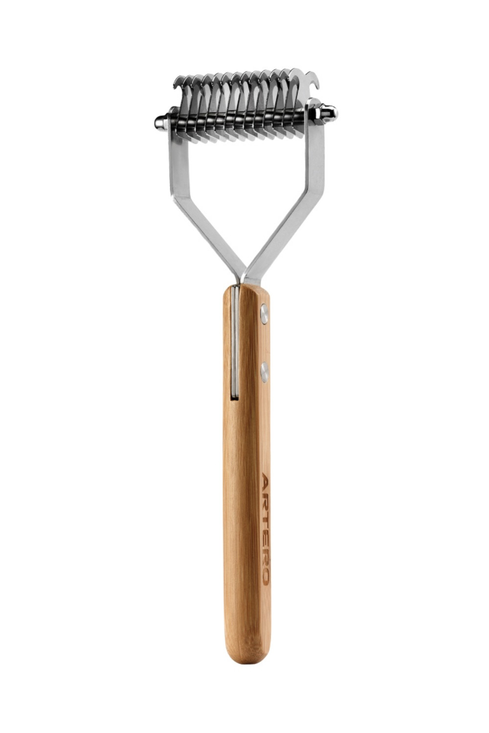 -Tiene una cara con 11 hojas, ideal para crines densas y enredados. También cuenta con una segunda cara de 21 hojas para crines menos densas.