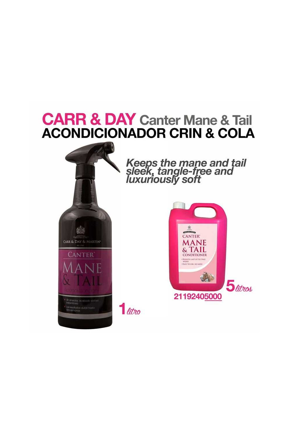 Mantiene las crines y la cola lisas, sin enredos y muy suaves.Reduce la rotura y hace el peinado rápido y fácil, dejando un brillo natural y libre de aceite. APLICACIÓNCrines: Pulverice suavemente y cepillelas o peinelas bien.Cola: Sostenga la cola en horizontal, pulverice y después cepíllelas o peinelas por secciones. Se puede usar en cabello húmedo o seco.Los resultados son inmediatos y duran hasta 2 semanas.Formatos: 1 litro, 5 litros.