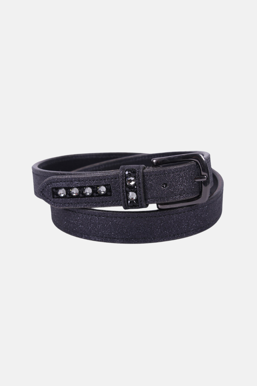 Exclusivo cinturón cubierto de brillos además de un decorado de diamantes en color plateado y negro. La hebilla negra logra terminar el look totalmente elegante.