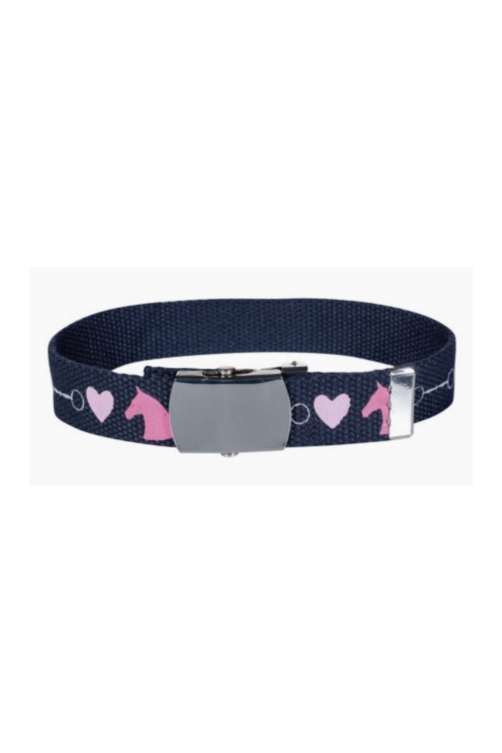 Cinturón de una calidad increíble para niños en color azul. Totalmente ajustable y diseñada en color marino con dibujos bordados en rosa.