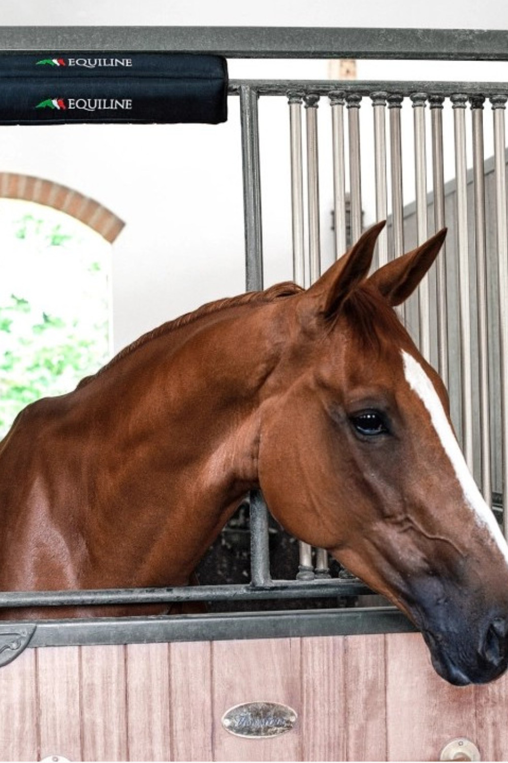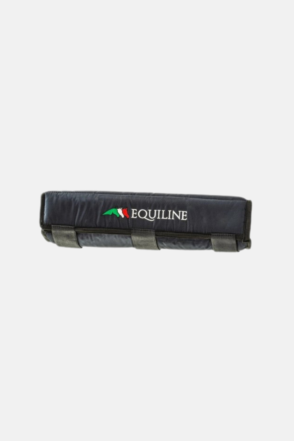 Protector de box para la nuca del caballo. Exterior de nailon con logotipo bordado, forro de neopreno acolchado con espuma. Tiene triple cierre con velcro.