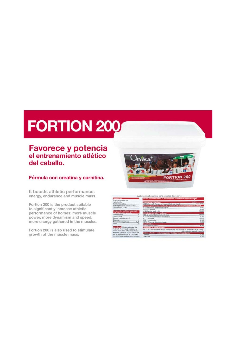 FORTION 200 es el producto adecuado para aumentar significativamente el rendimiento de los caballos de competición, dotándolos de mayor fuerza muscular, más dinamismo y velocidad, así como más energía recogida en los músculos. También se utiliza para estimular el crecimiento de la masa muscular.