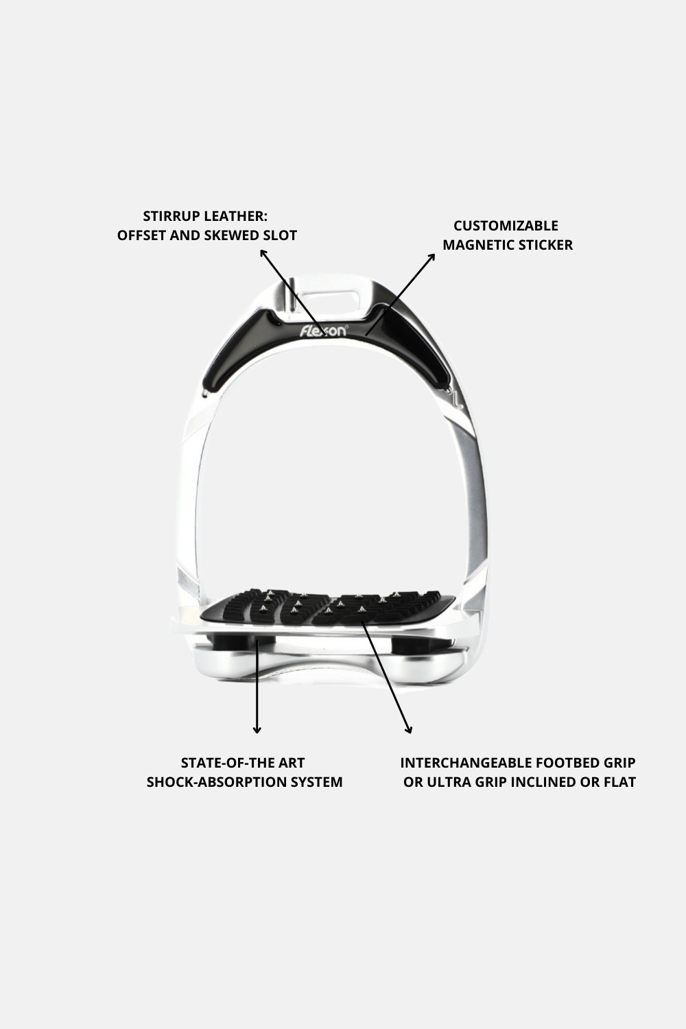 Cueros de estribo: ranura offset e inclinada para fomentar una posición óptima de las piernas, mejorando así la postura del jinete.