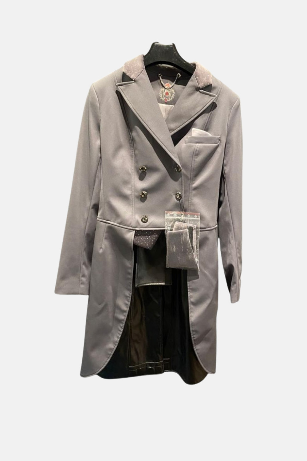 Tiene una parte de terciopelo en la parte del cuello y en la zona de la cadera. Este terciopelo también acompaña con unos brillos.