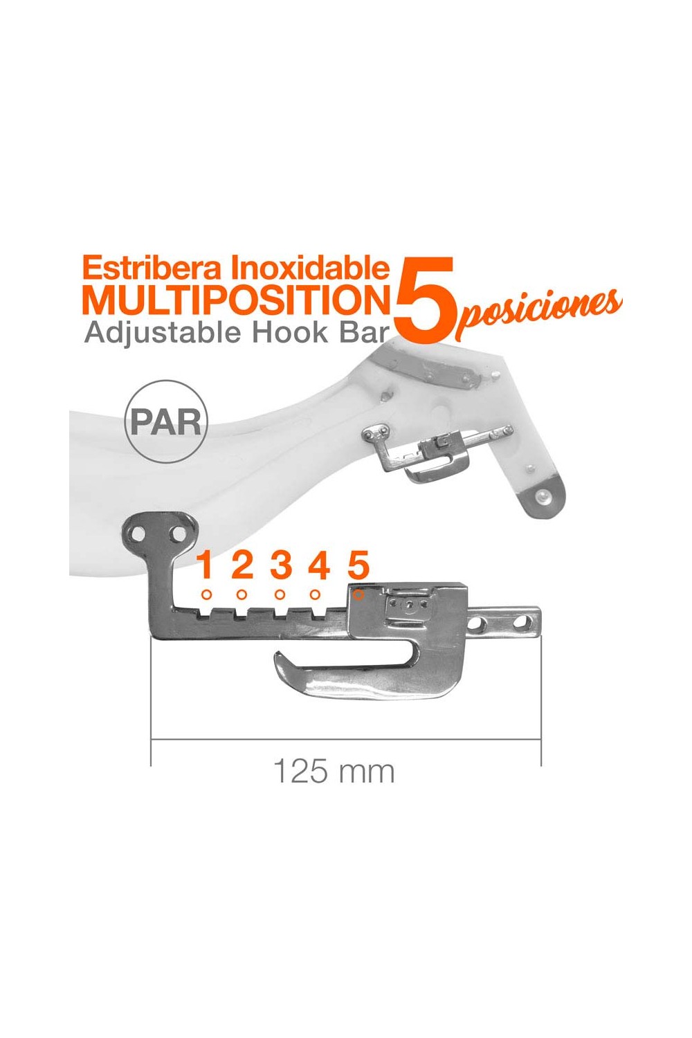 Estribera inoxidable multiposición, con 5 posiciones para las aciones de estribo.