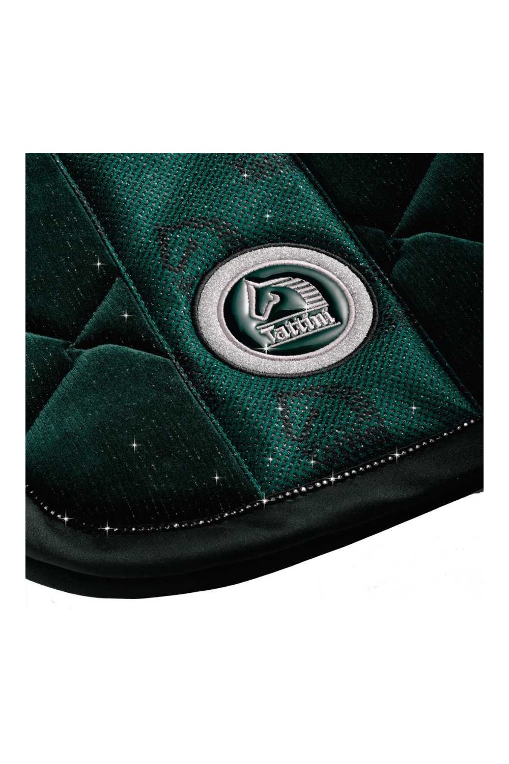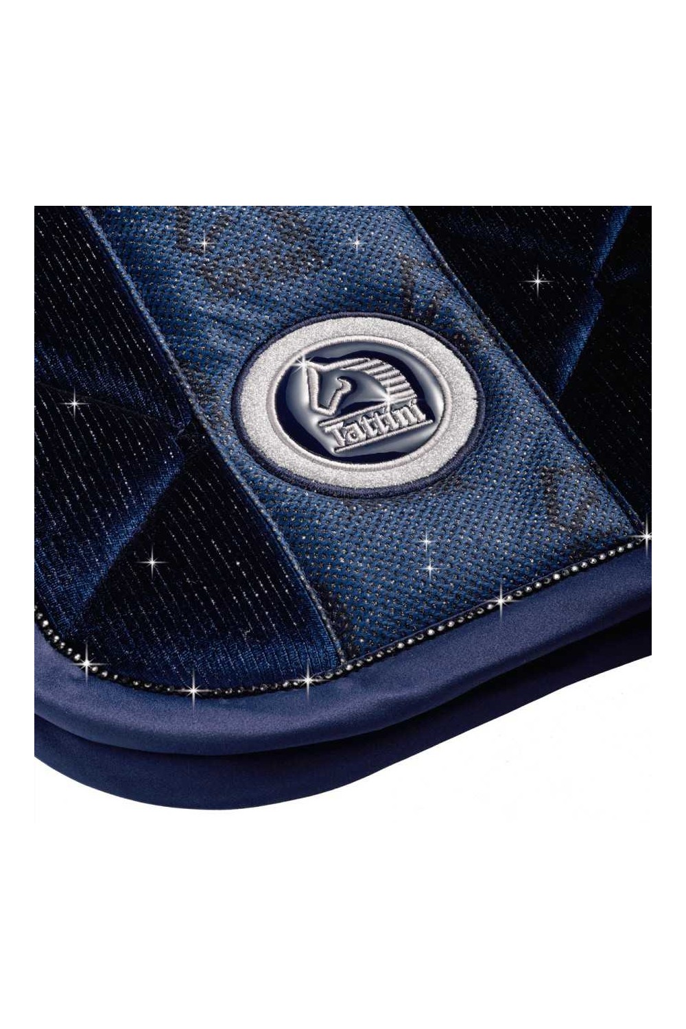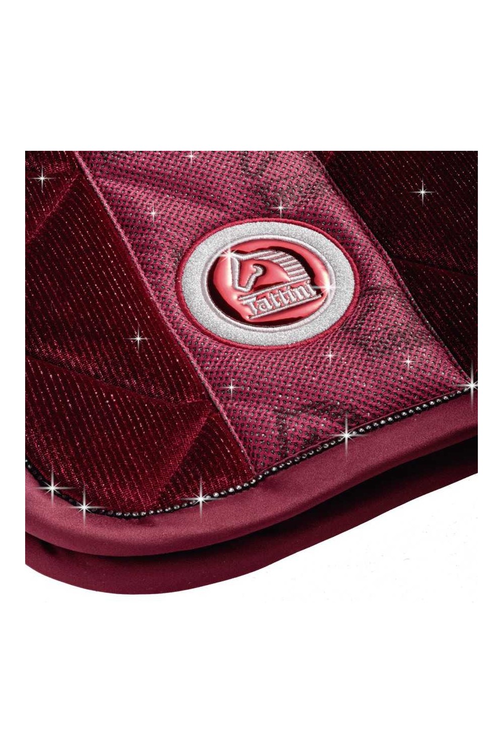 En tejido técnico de microfibra con pespuntes de rombos, efecto corduroy con filamentos de lúrex, borde de satén y fila de brillantes. Decorado con una banda vertical con el logo de Tattini formando un mosaico y una preciosa insignia de lúrex plateada en ambos lados. Con forma en la cruz, forro de micro-mesh con relleno de espuma de 8 mm y polyfill de 240 g.
