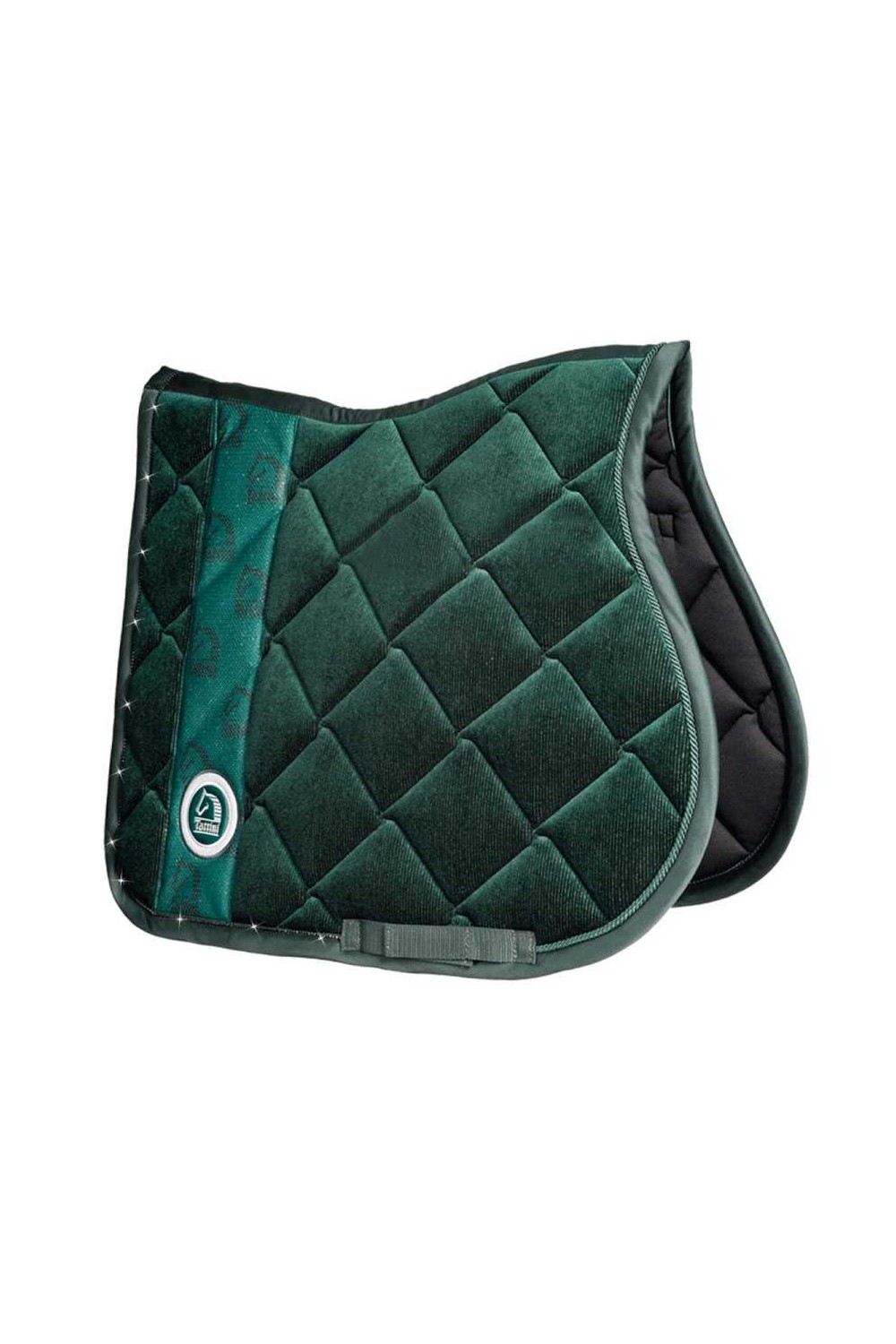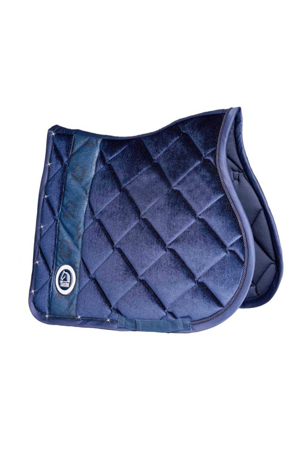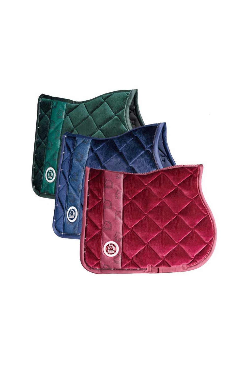 En tejido técnico de microfibra con pespuntes de rombos, efecto corduroy con filamentos de lúrex, borde de satén y fila de brillantes. Decorado con una banda vertical con el logo de Tattini formando un mosaico y una preciosa insignia de lúrex plateada en ambos lados. Con forma en la cruz, forro de micro-mesh con relleno de espuma de 8 mm y polyfill de 240 g.