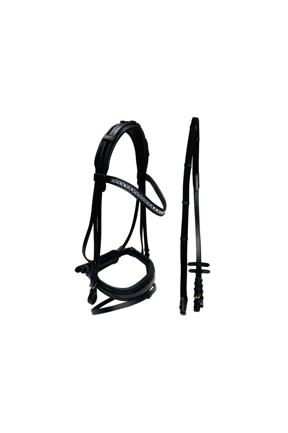 Cabezada inglesa para filete con forma ergonómica, realizada en cuero y decorada con brillantes de dos tamaños, excelentes acabados y gran calidad. Con riendas de lona.