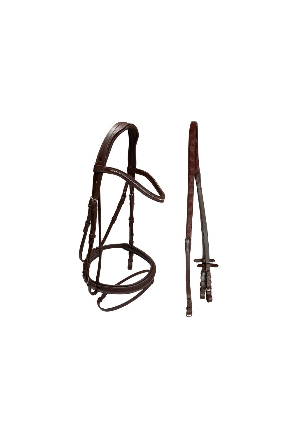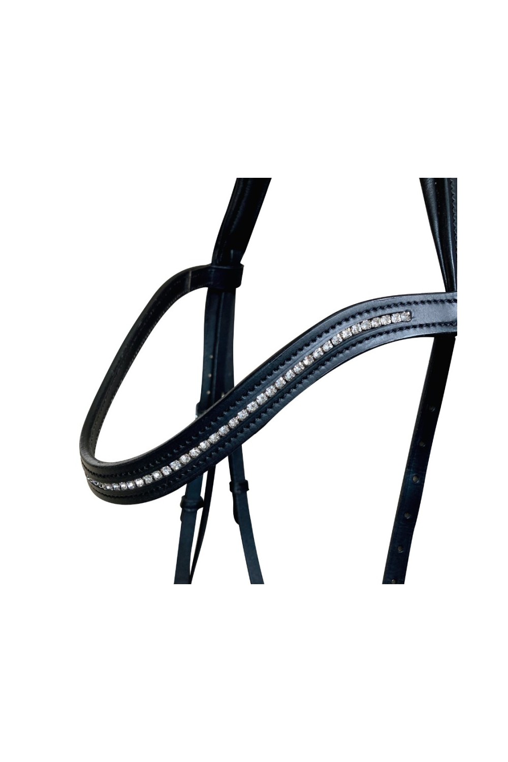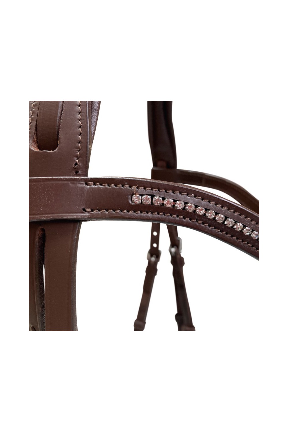 Cabezada inglesa para filete realizada en cuero y decorada con brillantes, excelentes acabados y gran calidad. Con riendas especiales Kris®.