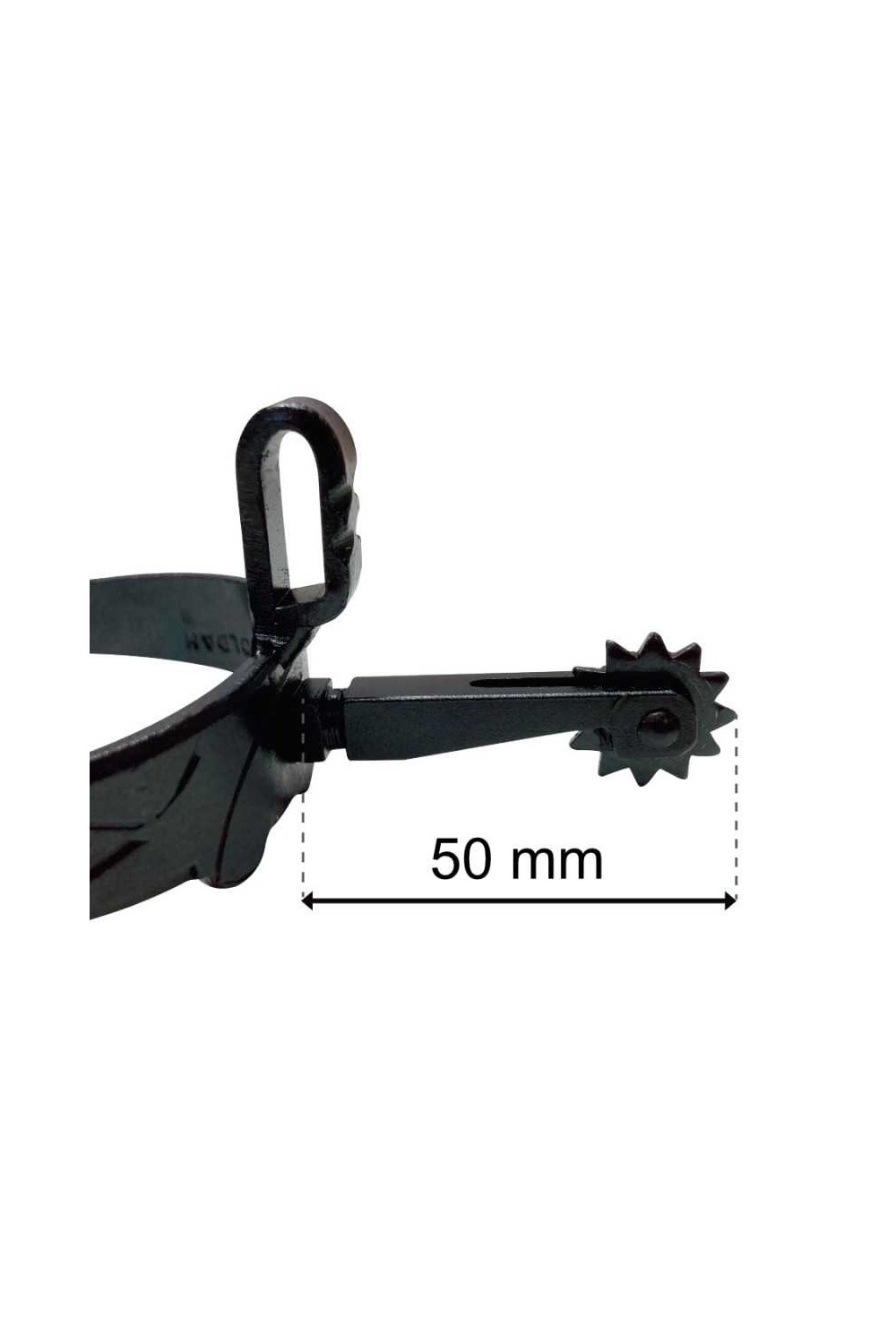 Espuela utilizada en la monta tradicional vaquera española, con acabado pavonado y ruleta inglesa con estrella de 12 puntas.