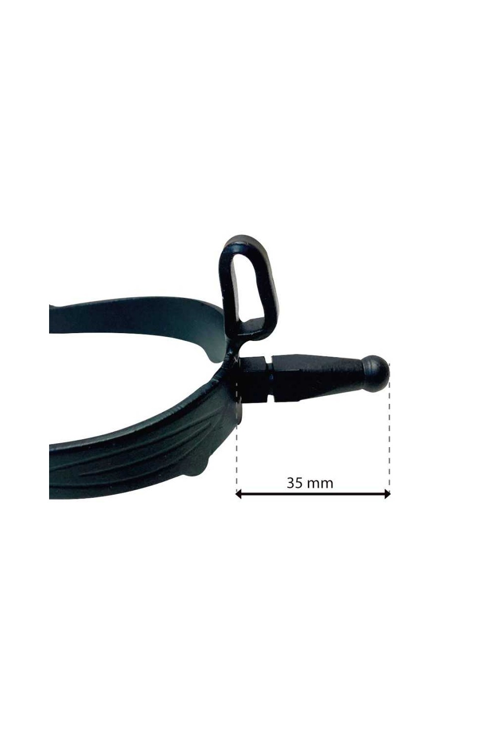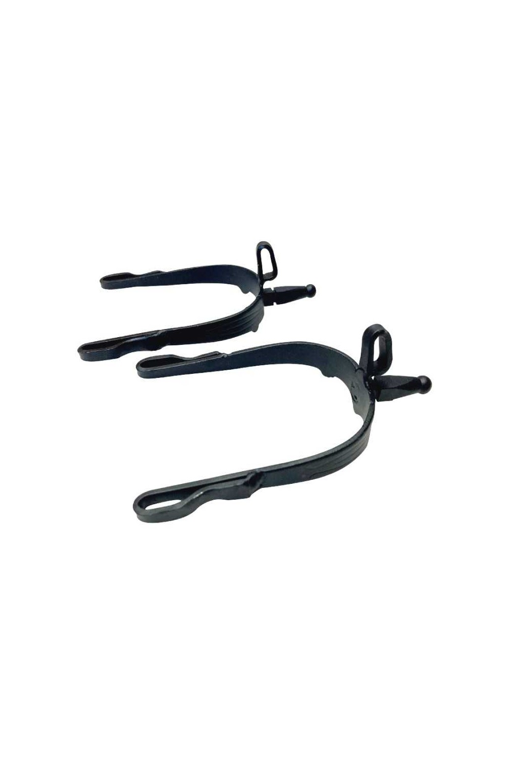 Espuela económica utilizada en la monta tradicional vaquera española, con acabado pavonado y gallo de contacto.