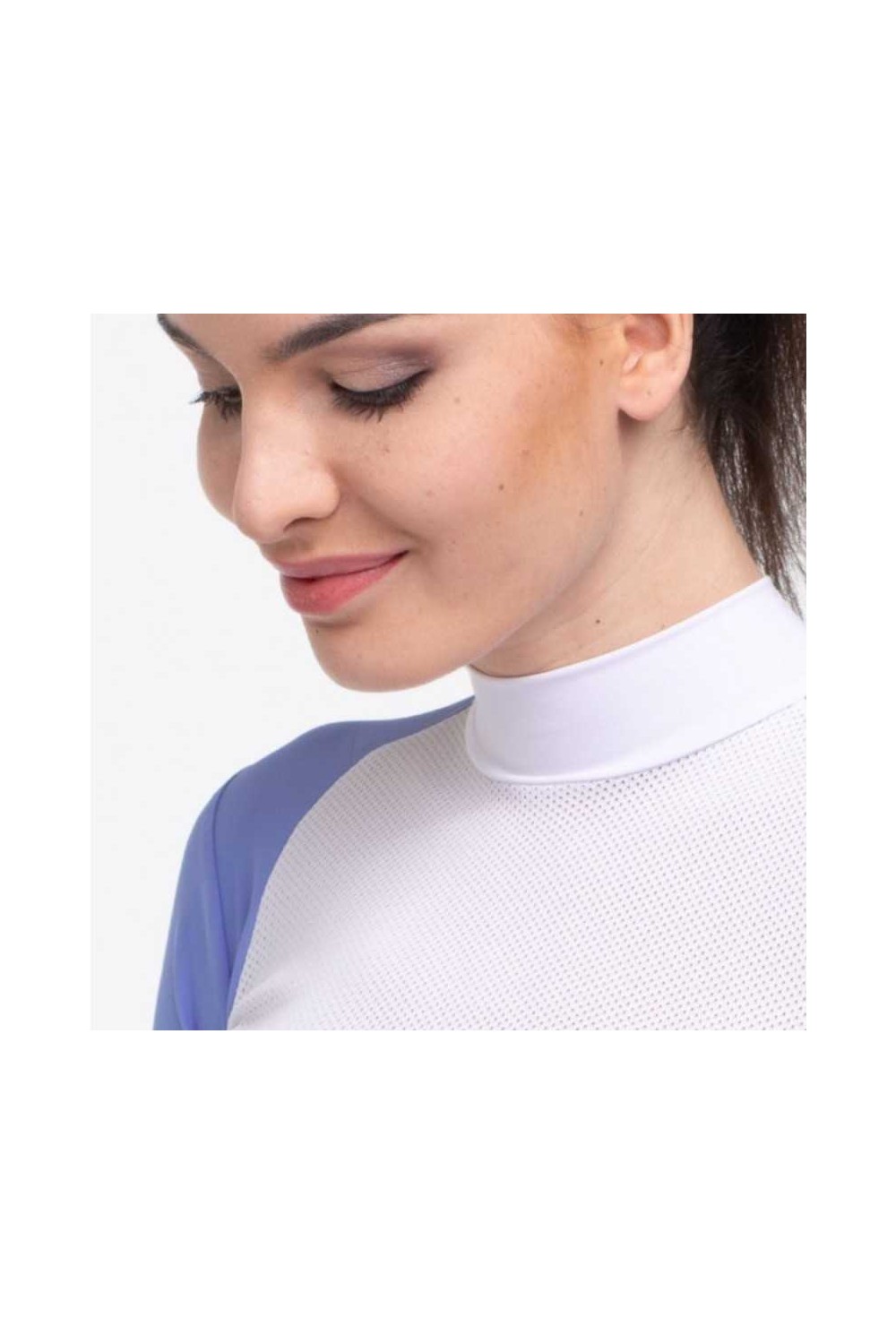 Esta camiseta de competición está confeccionada con tejido técnico de alto rendimiento con hilos microfinos, combinado con aplicaciones de malla para una sensación de comodidad y frescura. Esta camiseta técnica de color azul claro permite que la humedad escape del cuerpo y así garantizar que la amazona se mantenga lo más fresca y cómoda posible mientras está en la silla de montar. Es una prenda hípica para competición realmente bonita y funcional. Disponible en manga corta y larga.