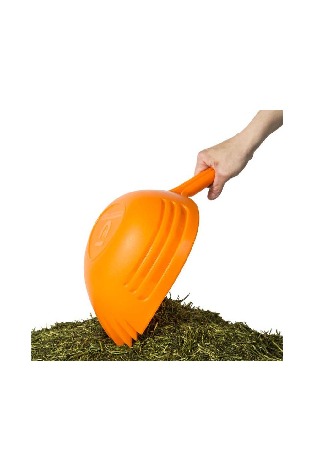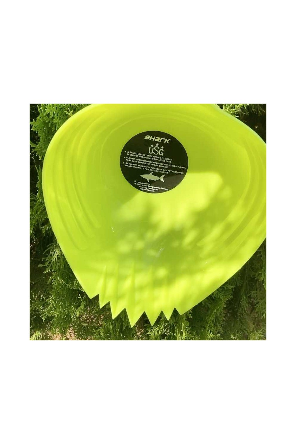 Capacidad de 2,5 litros. Tiene dientes que permiten al usuario escarbar en el alimento, lo que a veces es difícil con los cucharones normales. Shark es ideal para medir el alimento y el agua para caballos de forma rápida y precisa gracias a sus marcas indicadoras de medida.