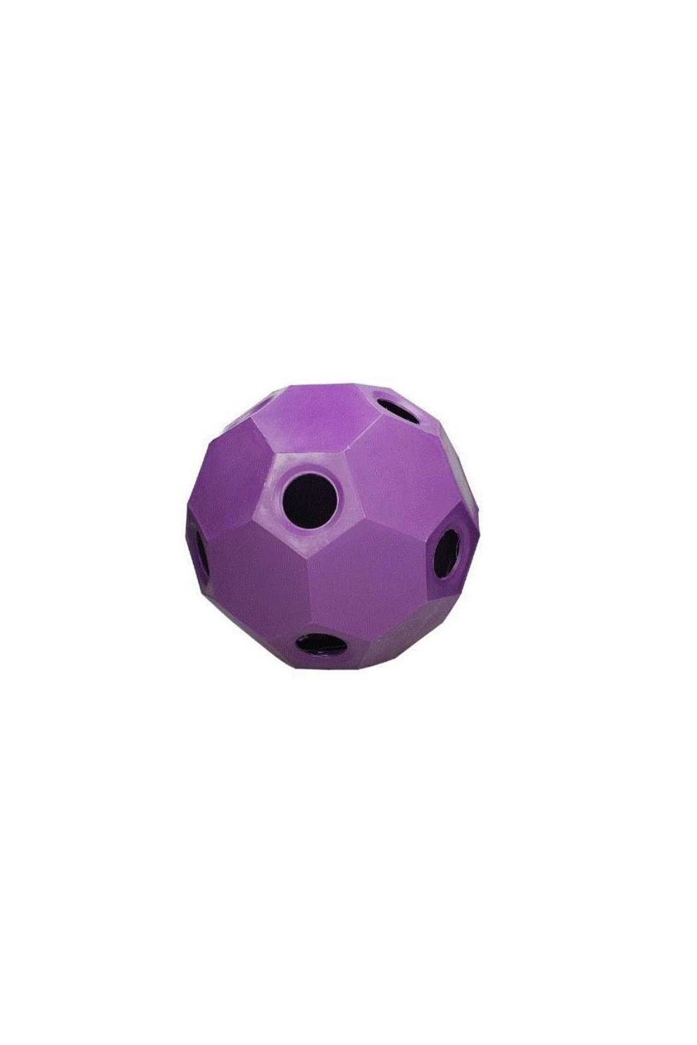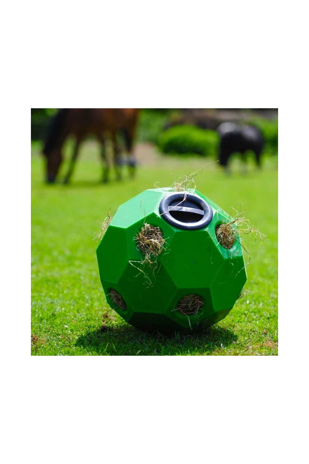Bola de juego y alimentación Happy Hay Play para una alimentación de heno saludable, agradable y lenta. Adecuado para uso en paddock, campo y establo. La bola poligonal se puede mover libremente, sin acelerar demasiado. Alimentación en posición natural. Hecha de plástico grueso y resistente. La bola se puede llenar hasta con 3 kg de heno. 43 cm de diámetro. Peso de la pelota 2 kg. Orificios de alimentación: 12 x 70 mm