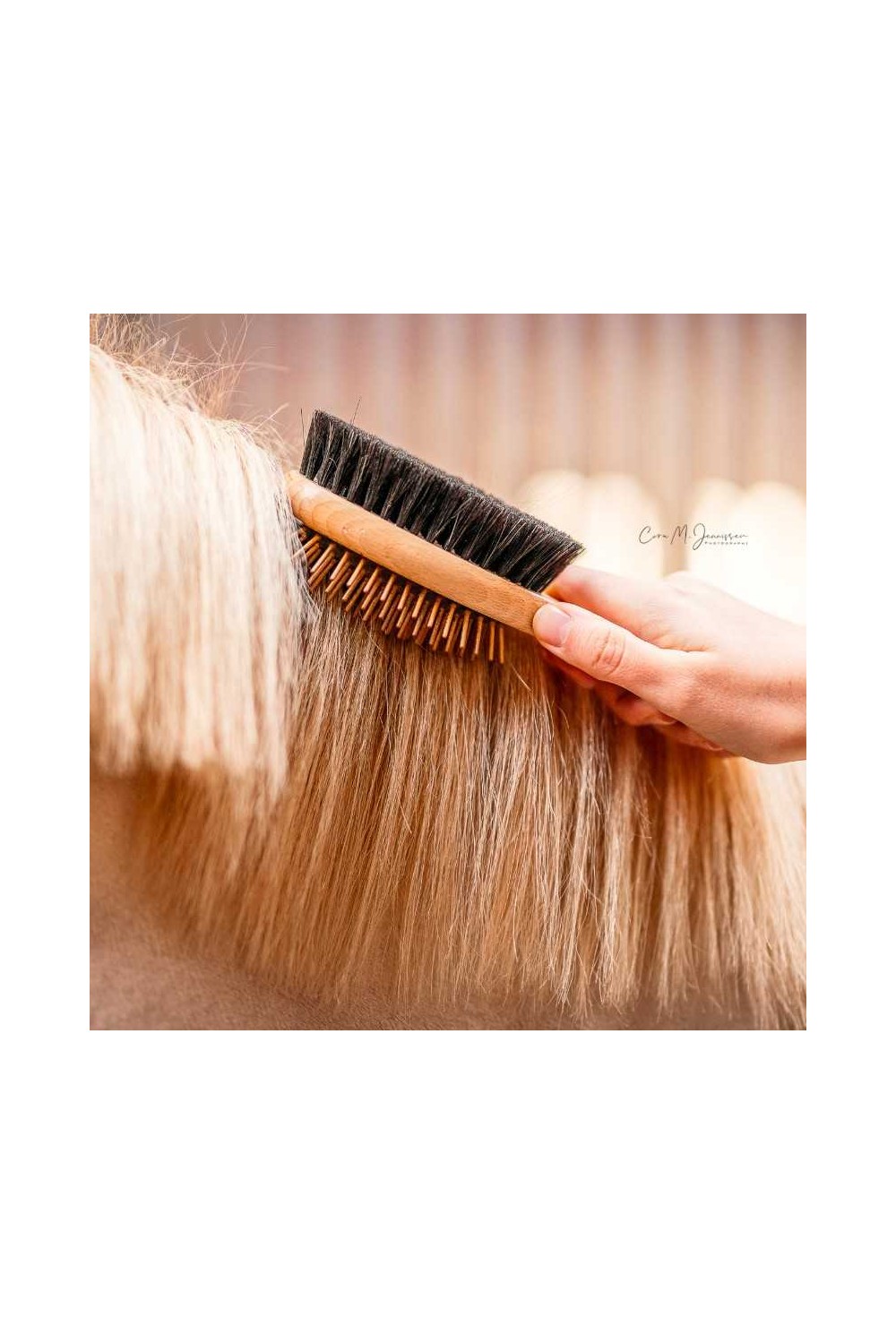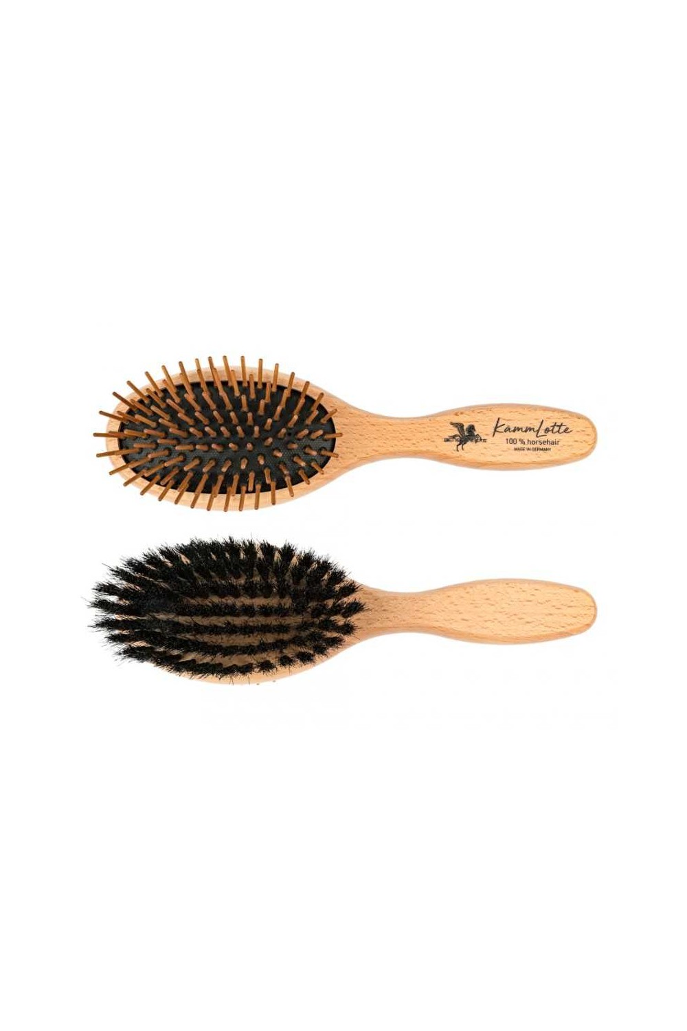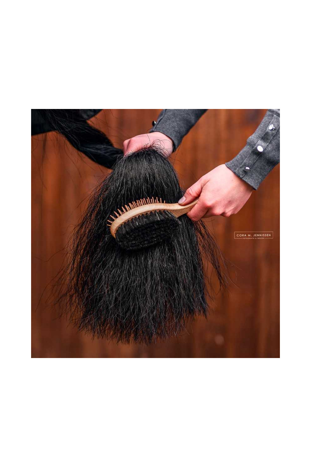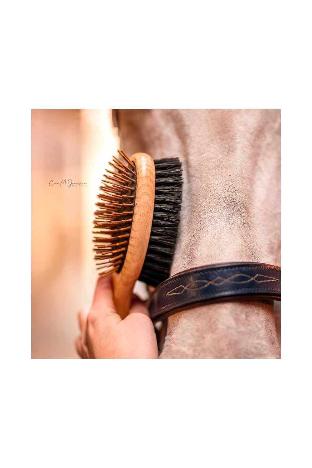 Las púas de madera de haya suavemente pulidas del Kí¤mmLotte se deslizan suavemente a través de la melena y la cola sin arrancar el pelo. Las densas crines de caballo eliminan cada grano de polvo de la cabeza y proporcionan un acabado perfectamente brillante. Para crin, cola y cara.