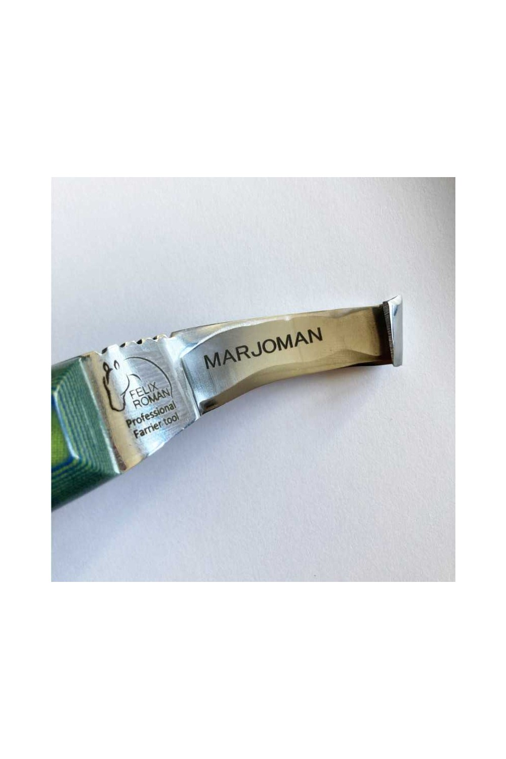 Legra de cuchilla fija fabricada por Félix Román especialmente para Marjoman. Mango en color verde y nombre de Marjoman grabado en el filo.